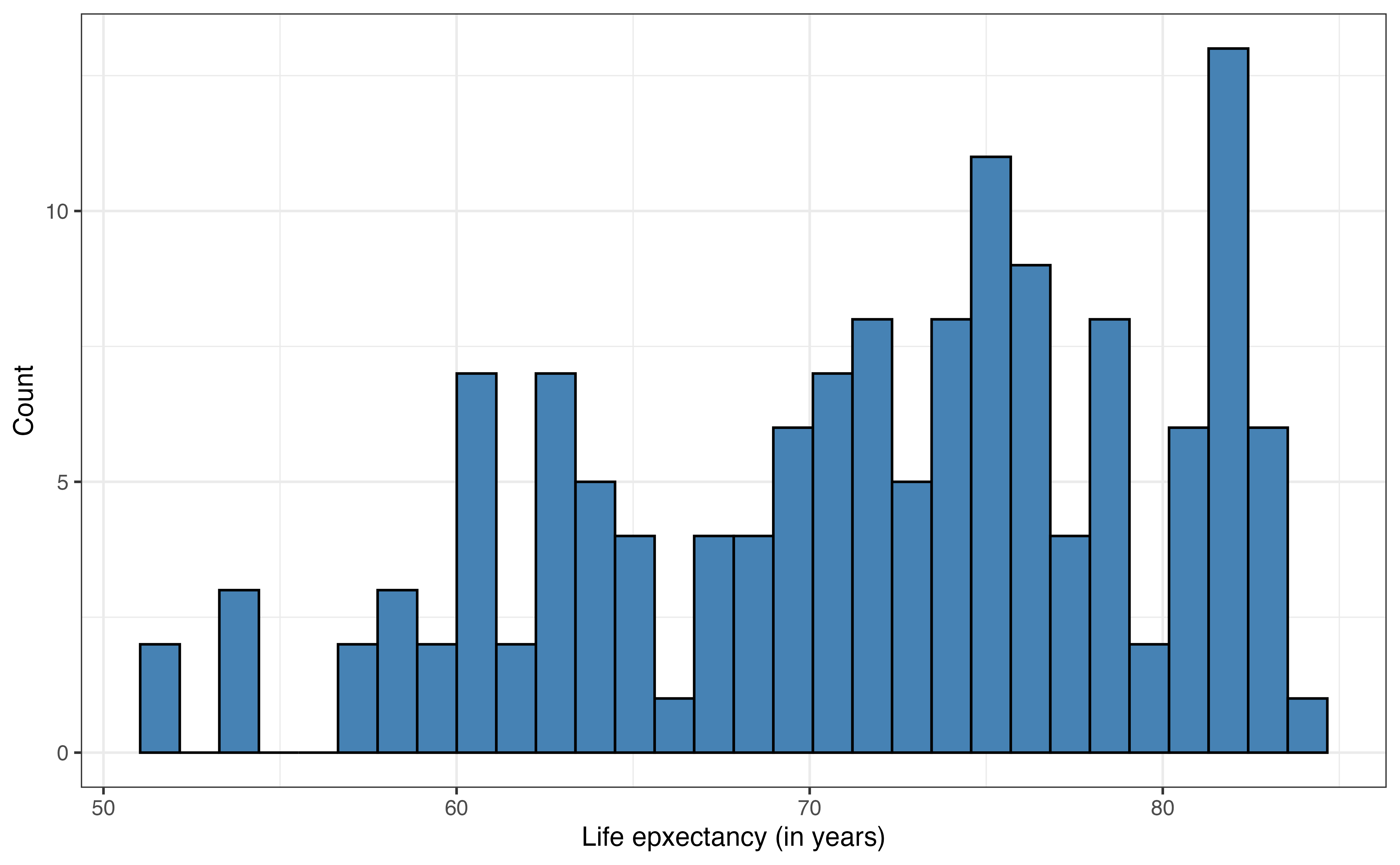 Example answers: Have the countries have life expectancy of 72.8 years or higher. There are a few countries with low life expectancy less than 55 years. There appear to be two subgroups of countries in regard to income inequality; those with income inequality between 5 and 15 and those between 20 and 30. There are two countries with high income inequality over 40.↩︎