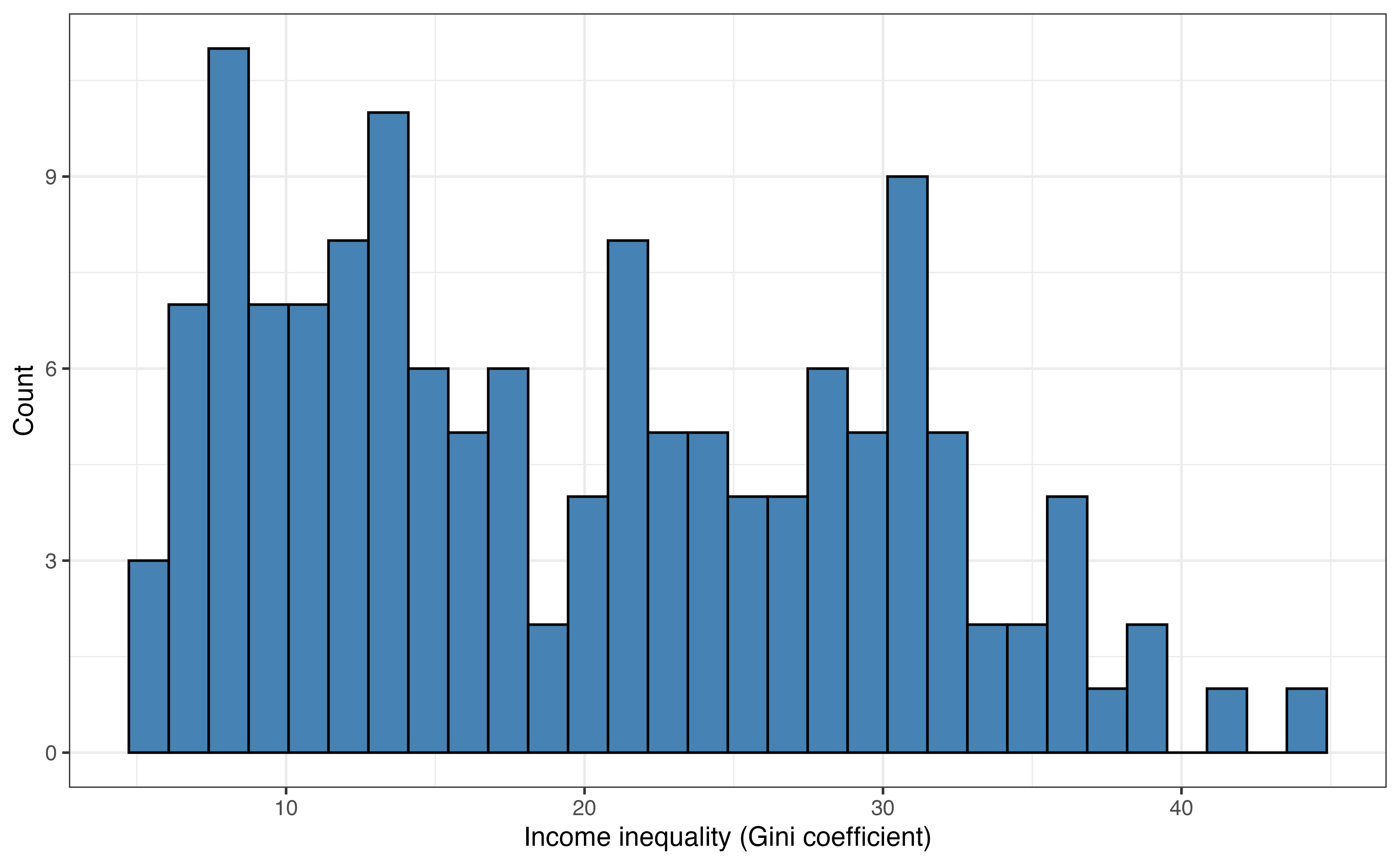 Figure 1.1 shows the distributions and Table 1.1 shows the summary statistics for life_expectancy and income_inequality. These are used to better understand the data, a process called exploratory data analysis (EDA). EDA is introduced more fully in Chapter 3.