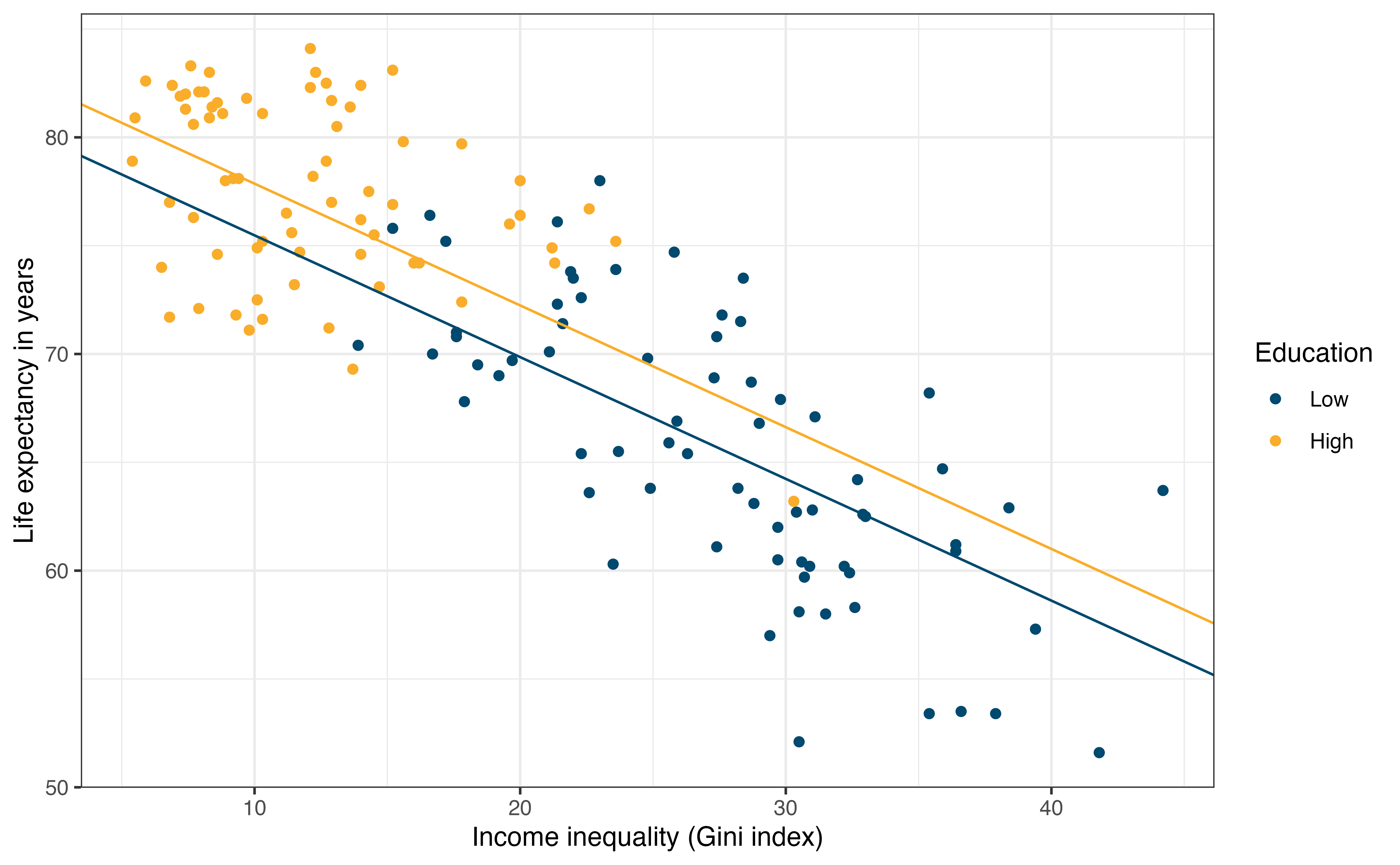 life_exp: The average number of years that a newborn could expect to live, if he or she were to pass through life exposed to the sex- and age-specific death rates prevailing at the time of his or her birth, for a specific year, in a given country, territory, or geographic area. (from the World Health Organization)income_inequality: Measure of the deviation of the distribution of income among individuals or households within a country from a perfectly equal distribution. A value of 0 represents absolute equality, a value of 100 absolute inequality (Gini coefficient). (from the Human Development Database)education: Indicator of whether a country’s education index is above (High) or below (Low) the median index for the 140 countries in the data set.- Education index: Average of mean years of schooling (of adults) and expected years of school (of children), both expressed as an index obtained by scaling wit the corresponding maxima. (from the Human Development Database)