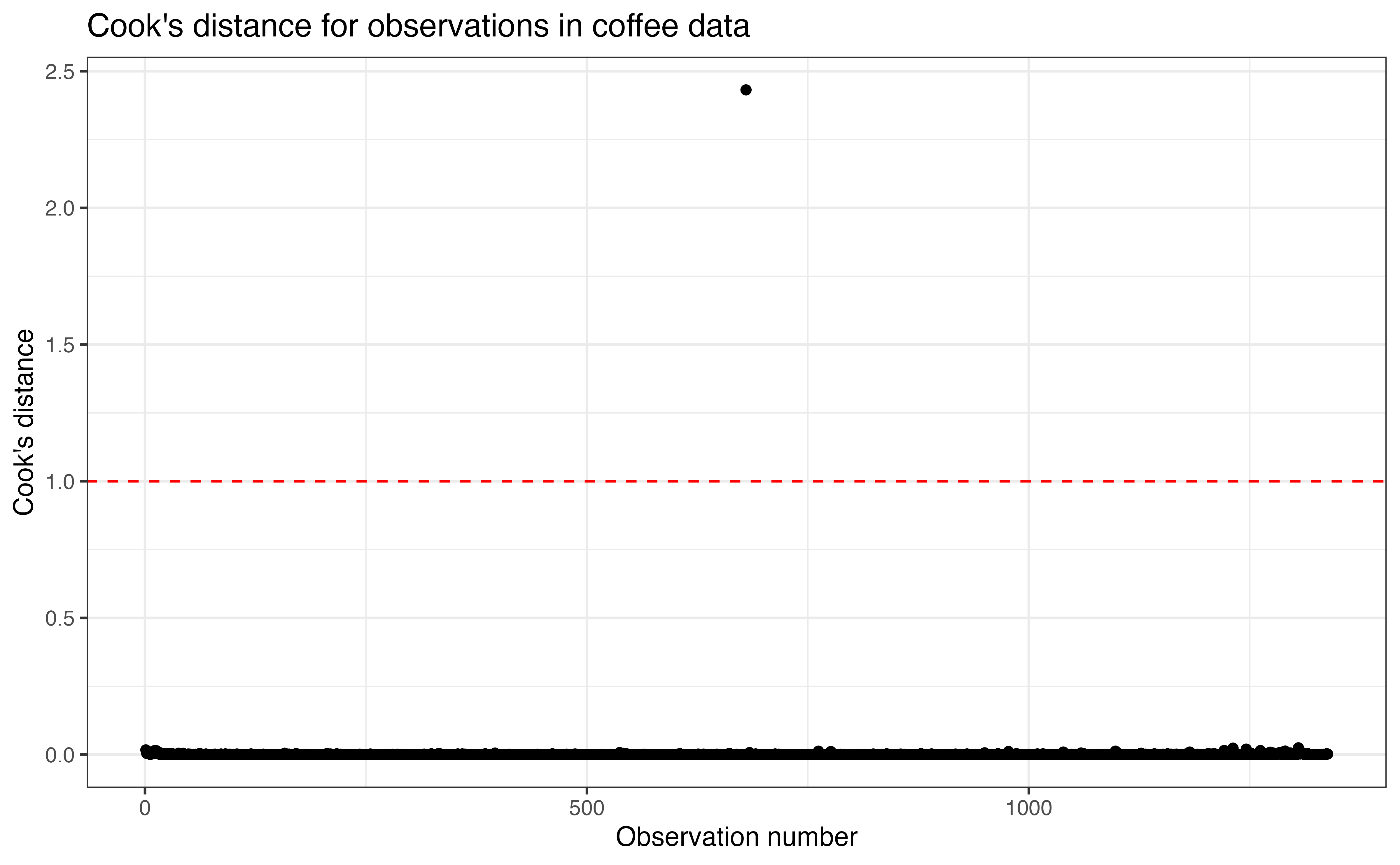 Figure 6.11 shows the values of Cook’s distance for the observations in the data set. It includes a horizontal line at 1 marking the threshold for determining if an observation is influential. There is one observation in the data that has a value of Cook’s distance greater than 1; its value is 2.432. This is the observation with an aroma grade of large_cooks$aroma and flavor grade of large_cooks$flavor.