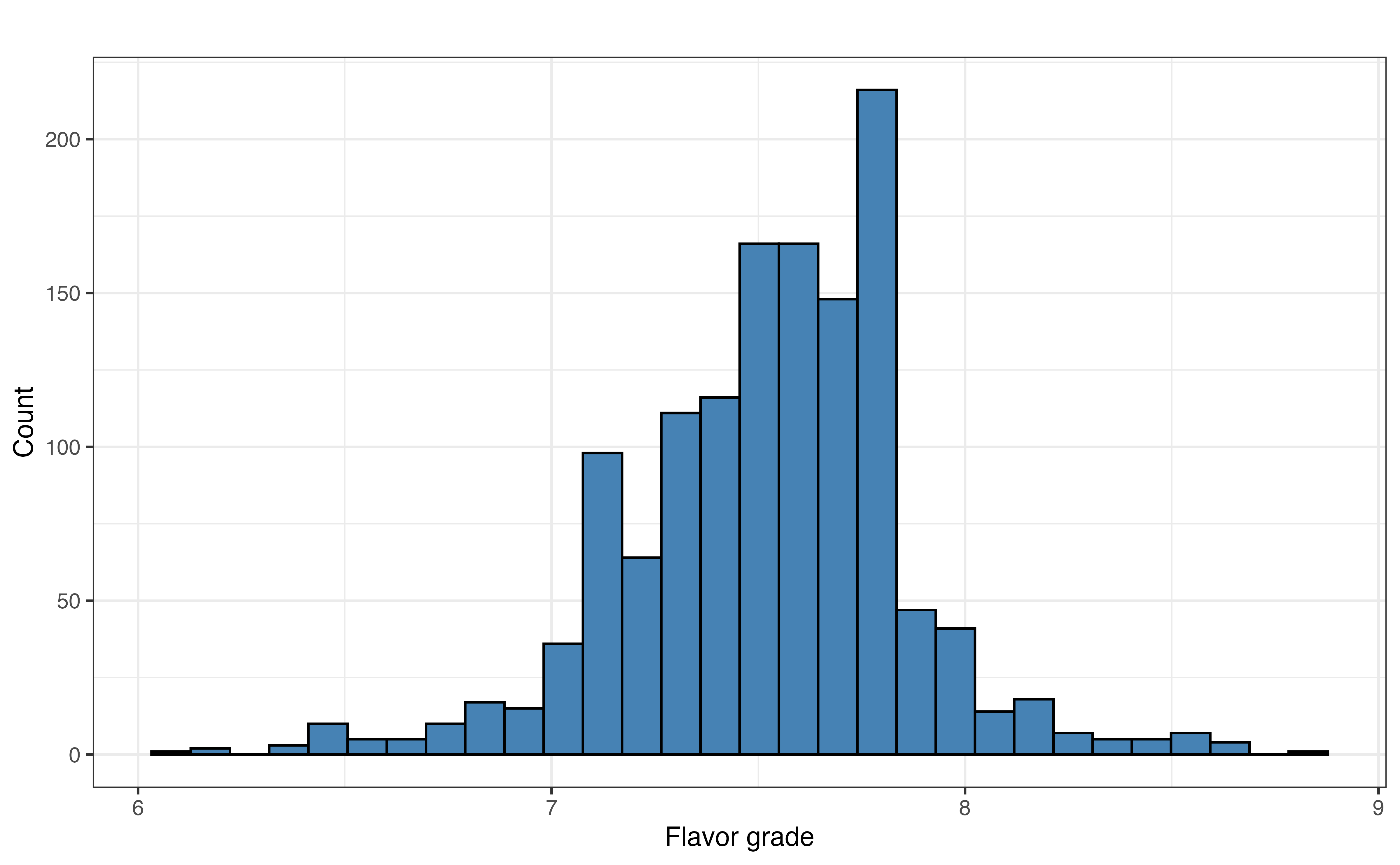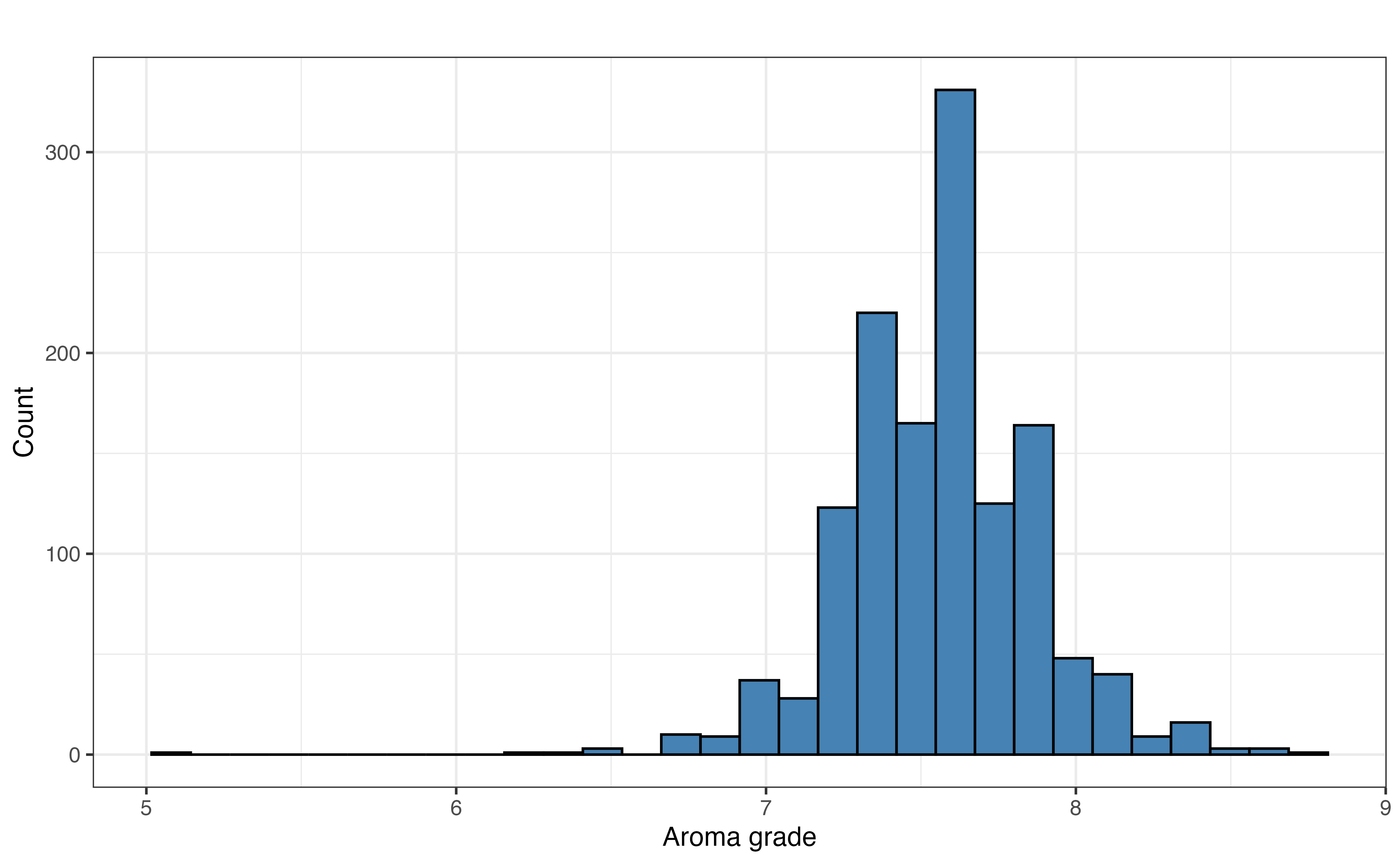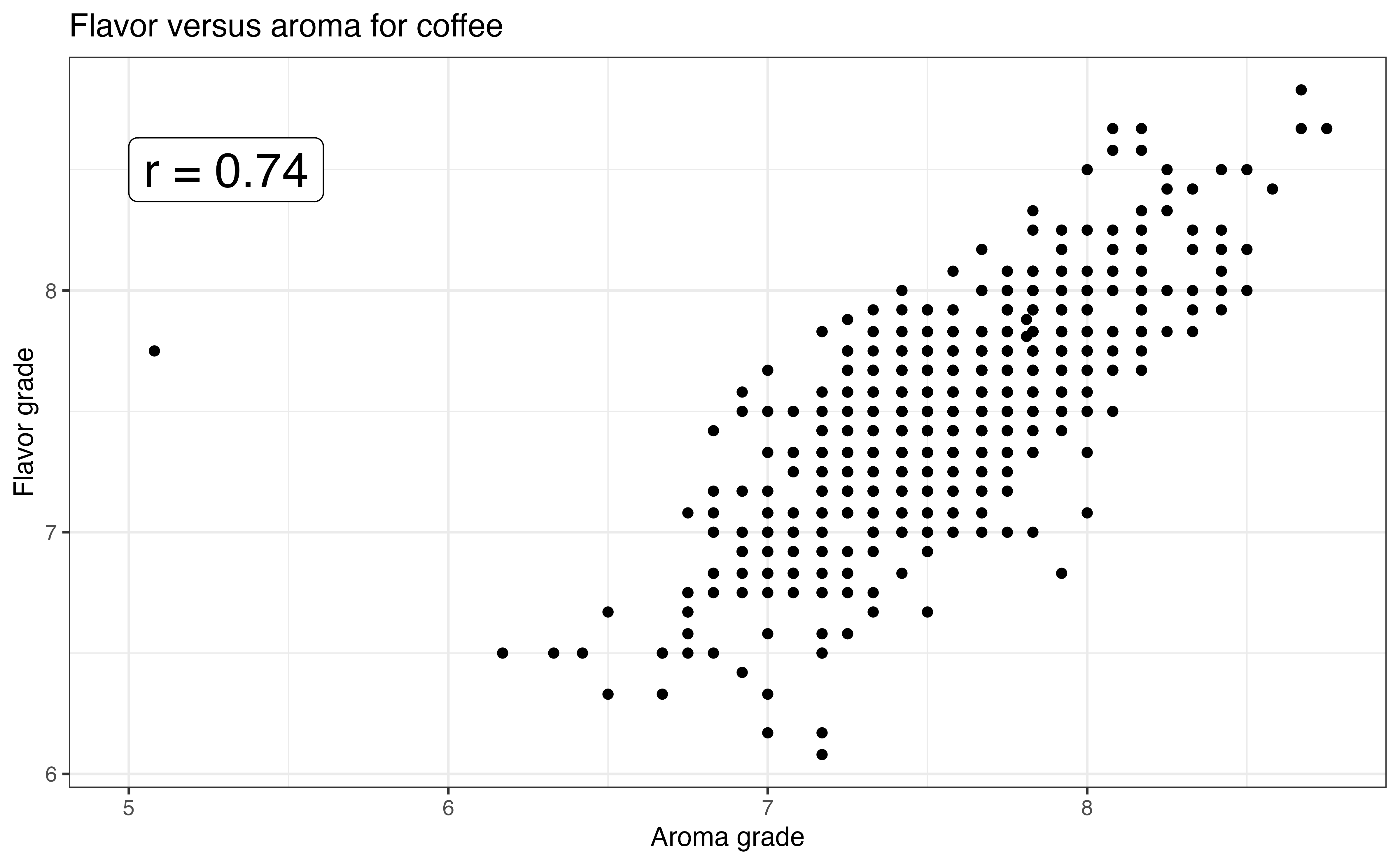 What makes a delicious cup of coffee? Is there a relationship between a coffee’s aroma and its flavor? We will consider these questions by analyzing data from the Coffee Quality Database (https://database.coffeeinstitute.org/). The data set used in this analysis was curated by James LeDoux and was featured as part of the TidyTuesday weekly data visualization challenge in July 2020 (Community 2024). It contains a variety of features and quality ratings for over 1,000 coffees scraped from the Coffee Quality Database in 2018.The data are in coffee-grades.csv. We will use the following variables in this chapter: