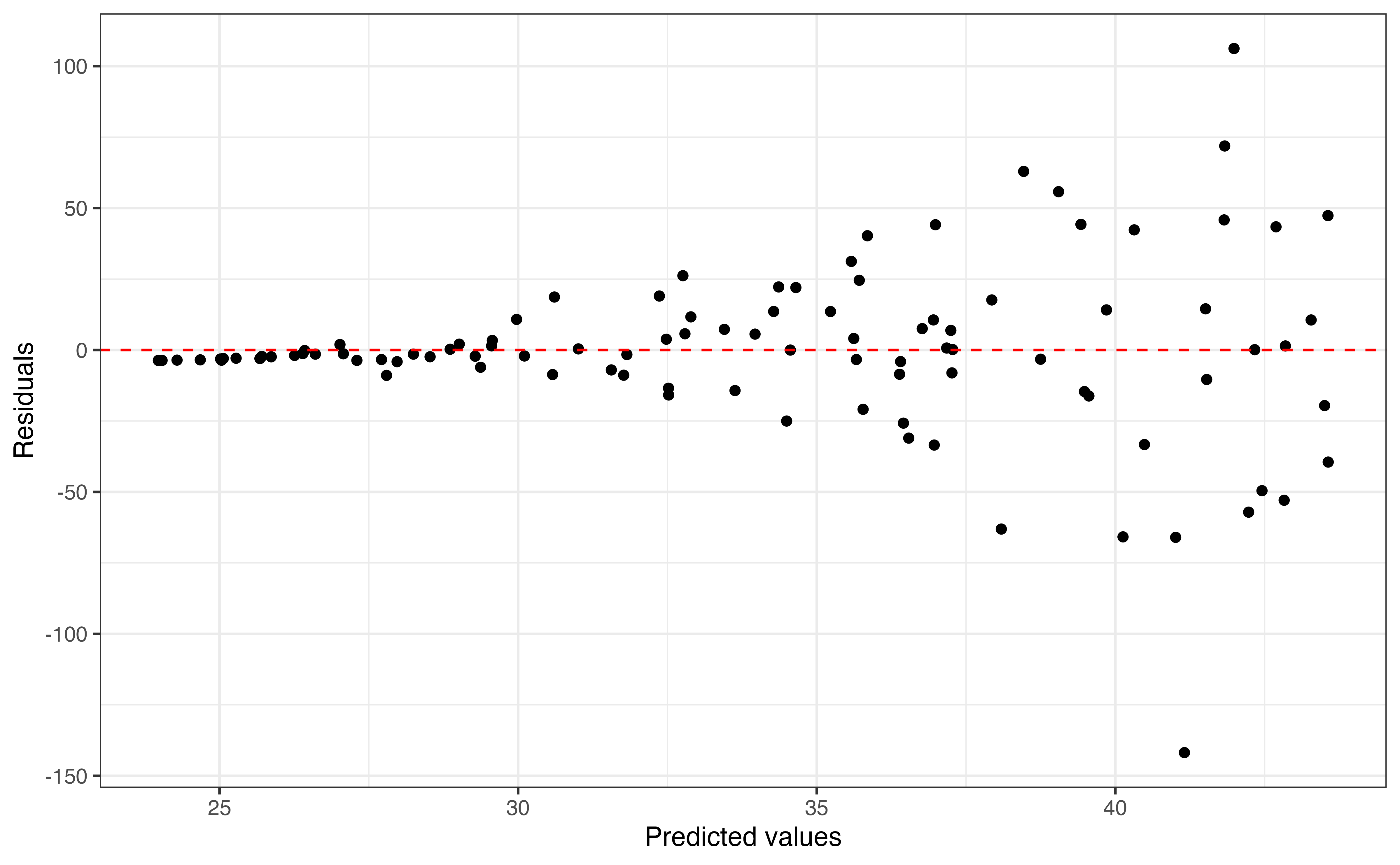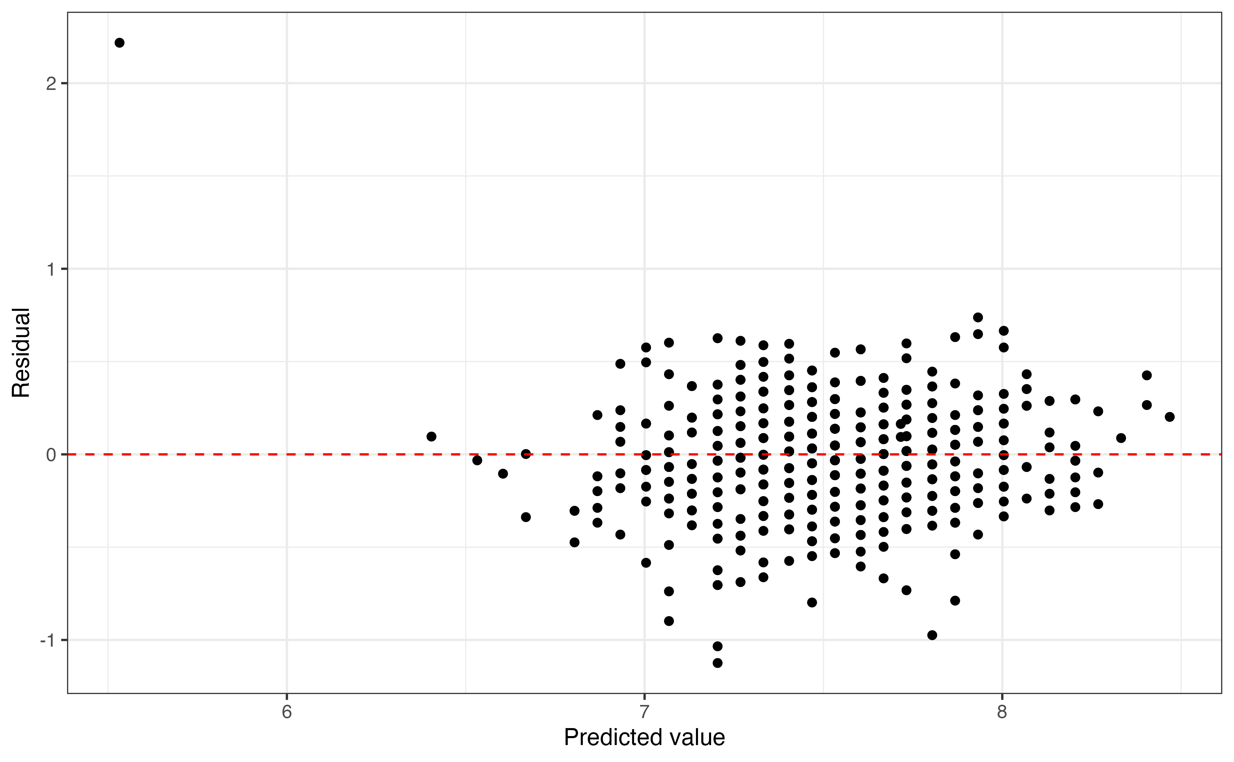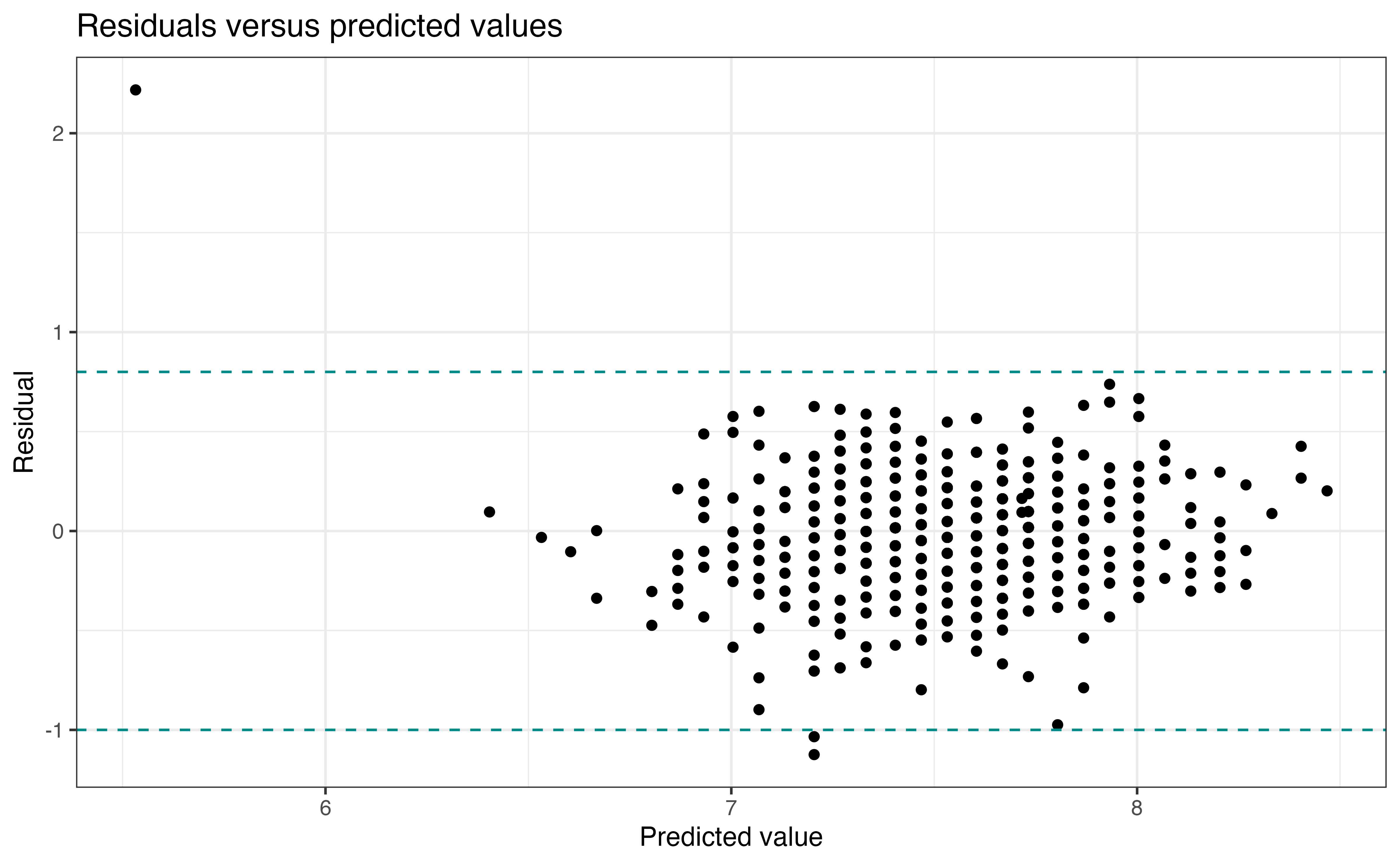 - Equal variance: The spread of the residuals is approximately equal for all predicted values.