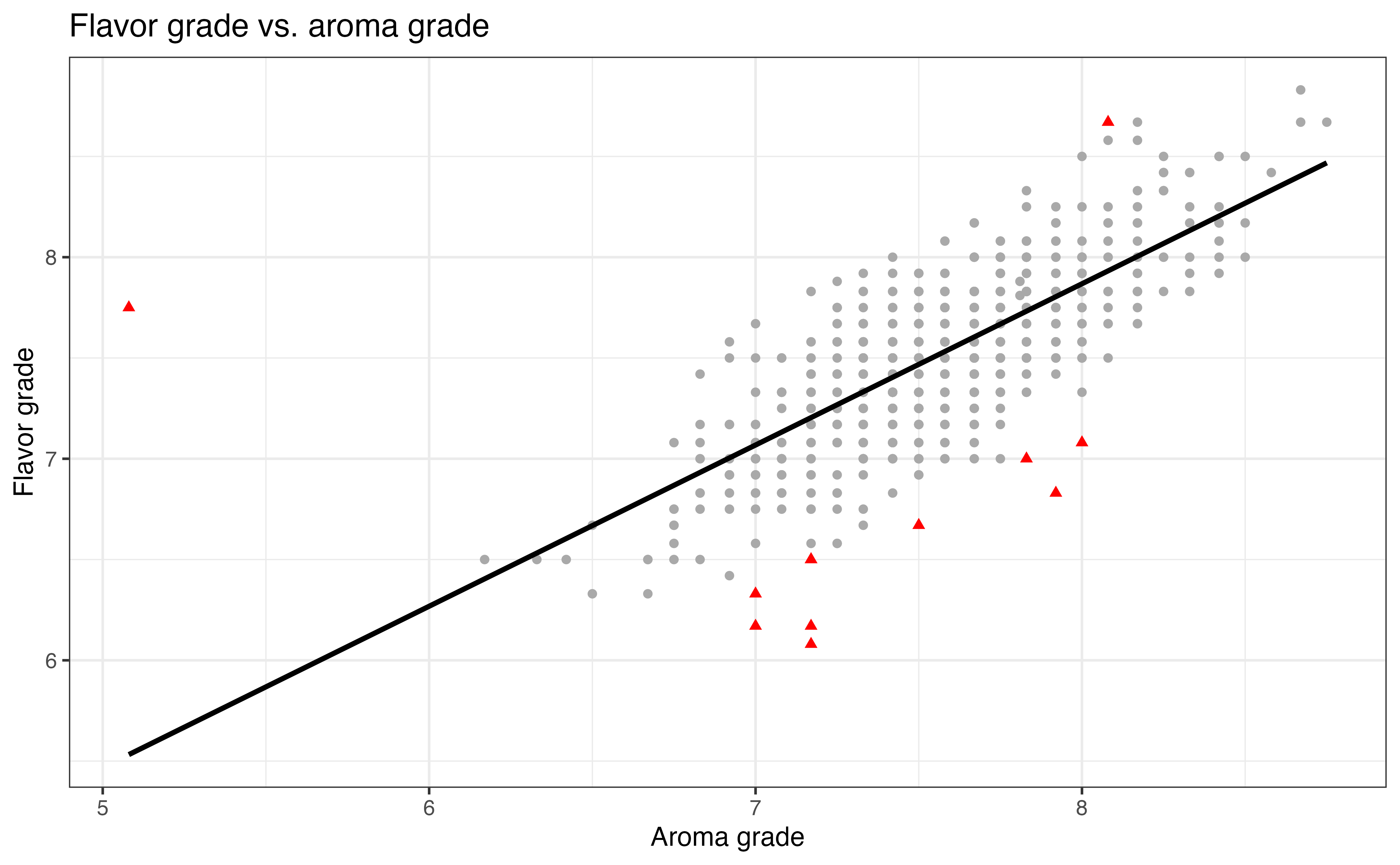 From the exploratory data analysis in Figure 6.1, we see preliminary indication of a relationship between the aroma and flavor grades. There is an outlier in Figure 6.1 (c) that has a very low aroma grade but a flavor grade close to the average.