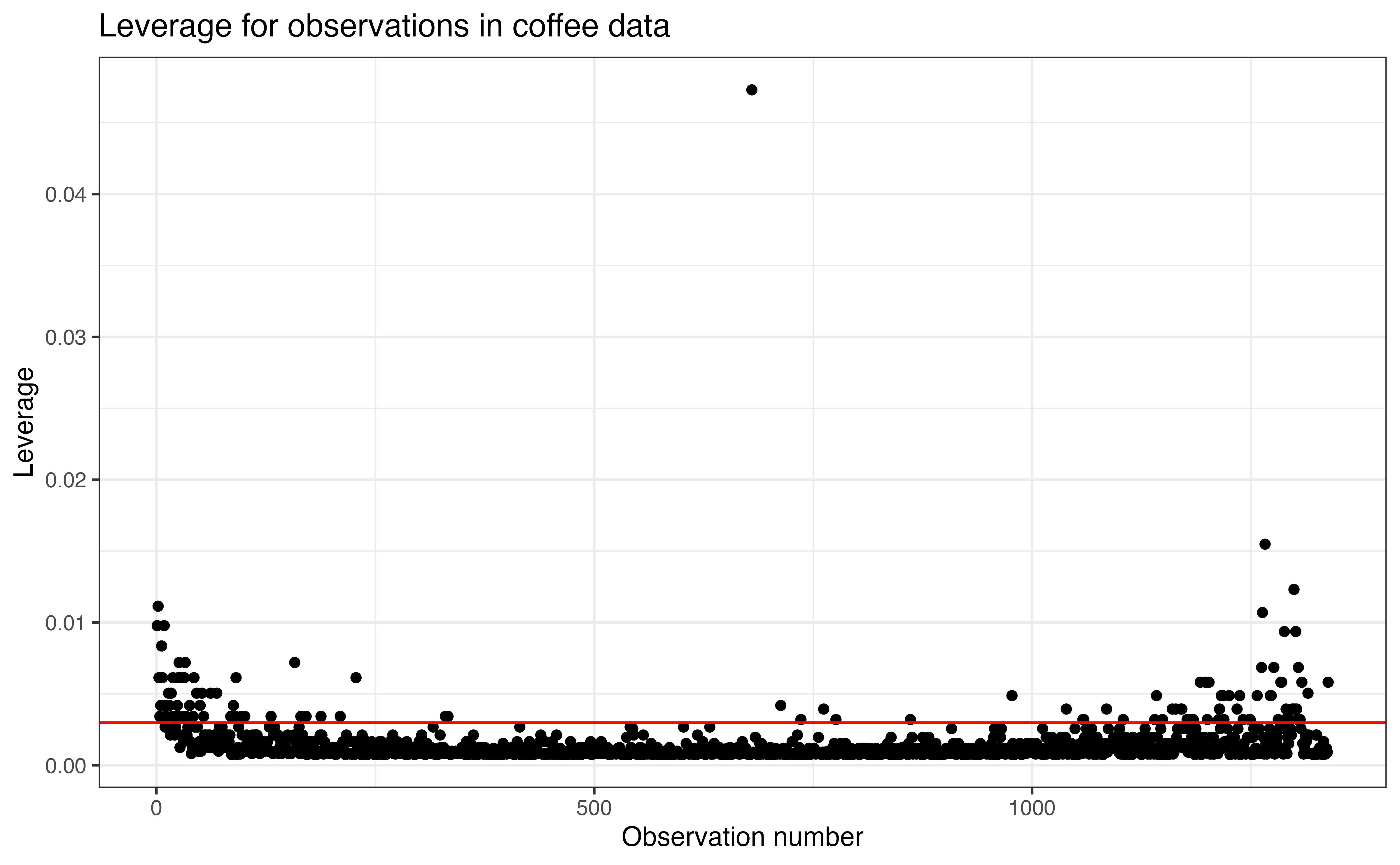 Let’s take a look at the leverage for the observations in the coffee ratings data set. There are 1338 observations in the data and one predictor variable, so the threshold for identifying observations with large leverage is \(\frac{2 \times 2}{1338} =\) 0.003.