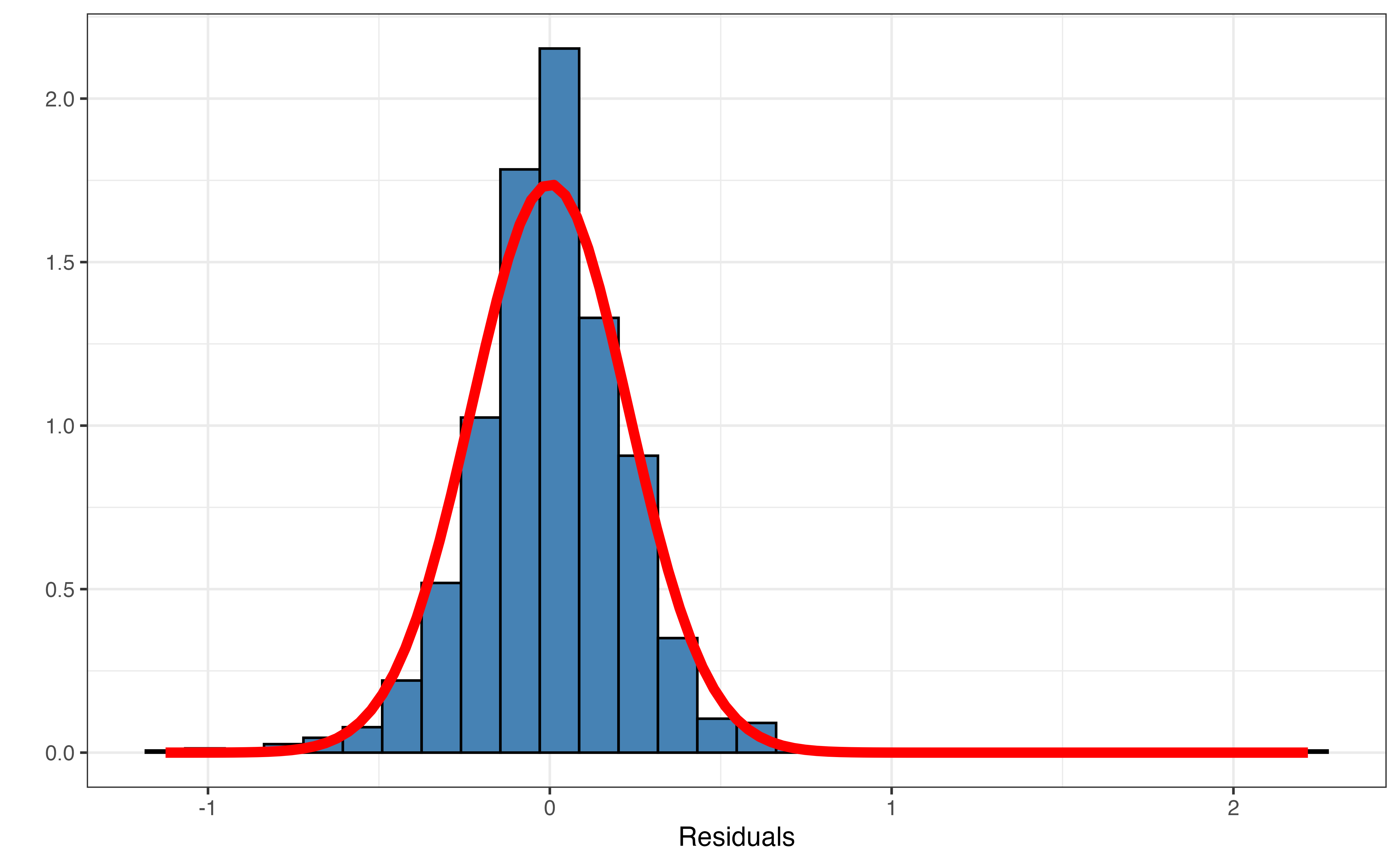 Figure 6.4 shows the distribution of the residuals along with the theoretical curve for a normal distribution that is centered at 0 the mean of the residuals, and a standard deviation of 0.229, the standard deviation of the residuals. Similar to the other conditions, we are looking for obvious departures from normality when assessing this condition. This might include strong skewness, multiple modes, large outliers, or other major departures from normality.