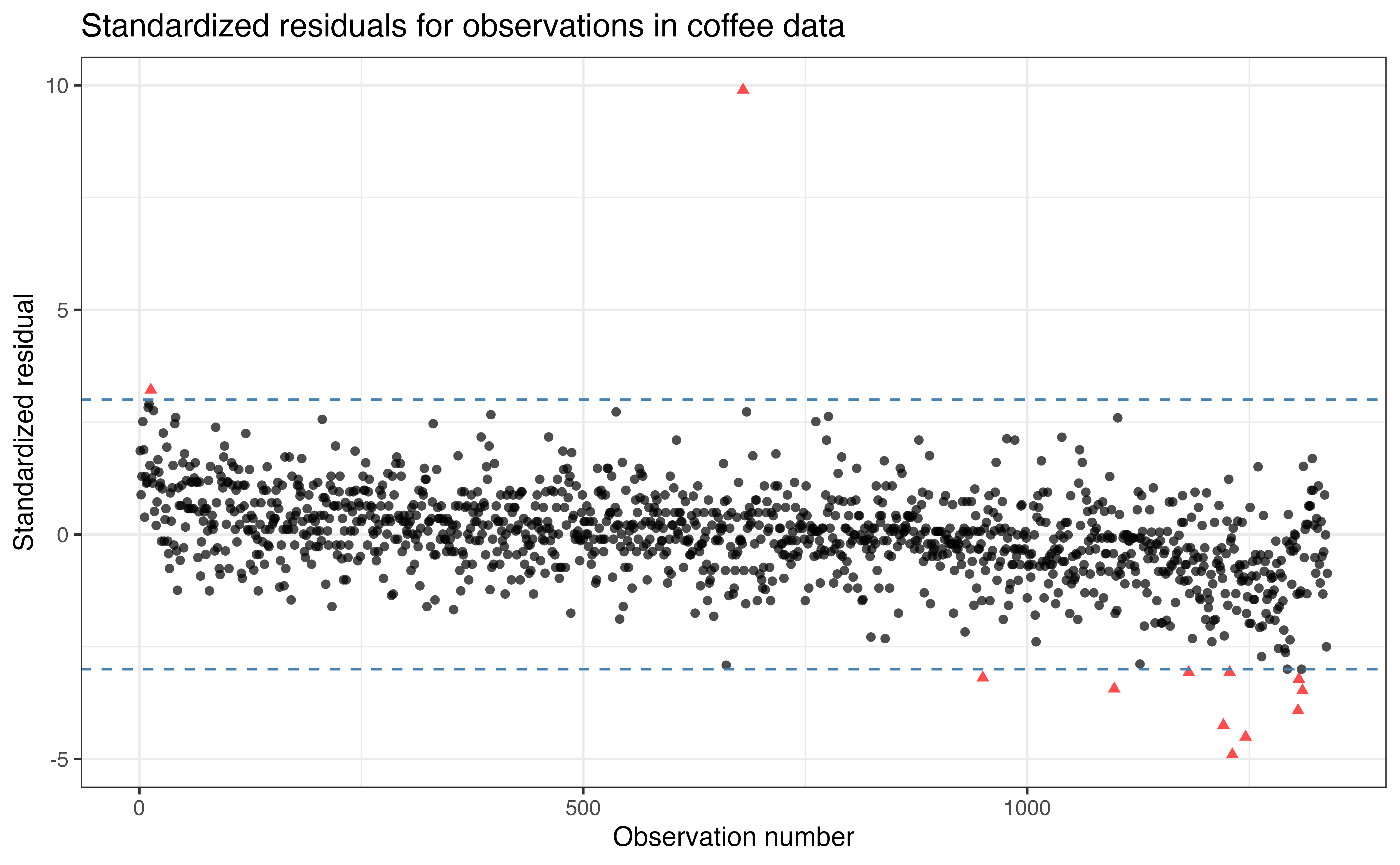 Figure 6.9 shows 12 observations with large magnitude residuals based on the threshold \(\pm 3\) . This includes observations that have positive residuals with large magnitude (indicating the model greatly underpredicted) and observations with negative residuals with large magnitude (indicating the model greatly overpredicted).