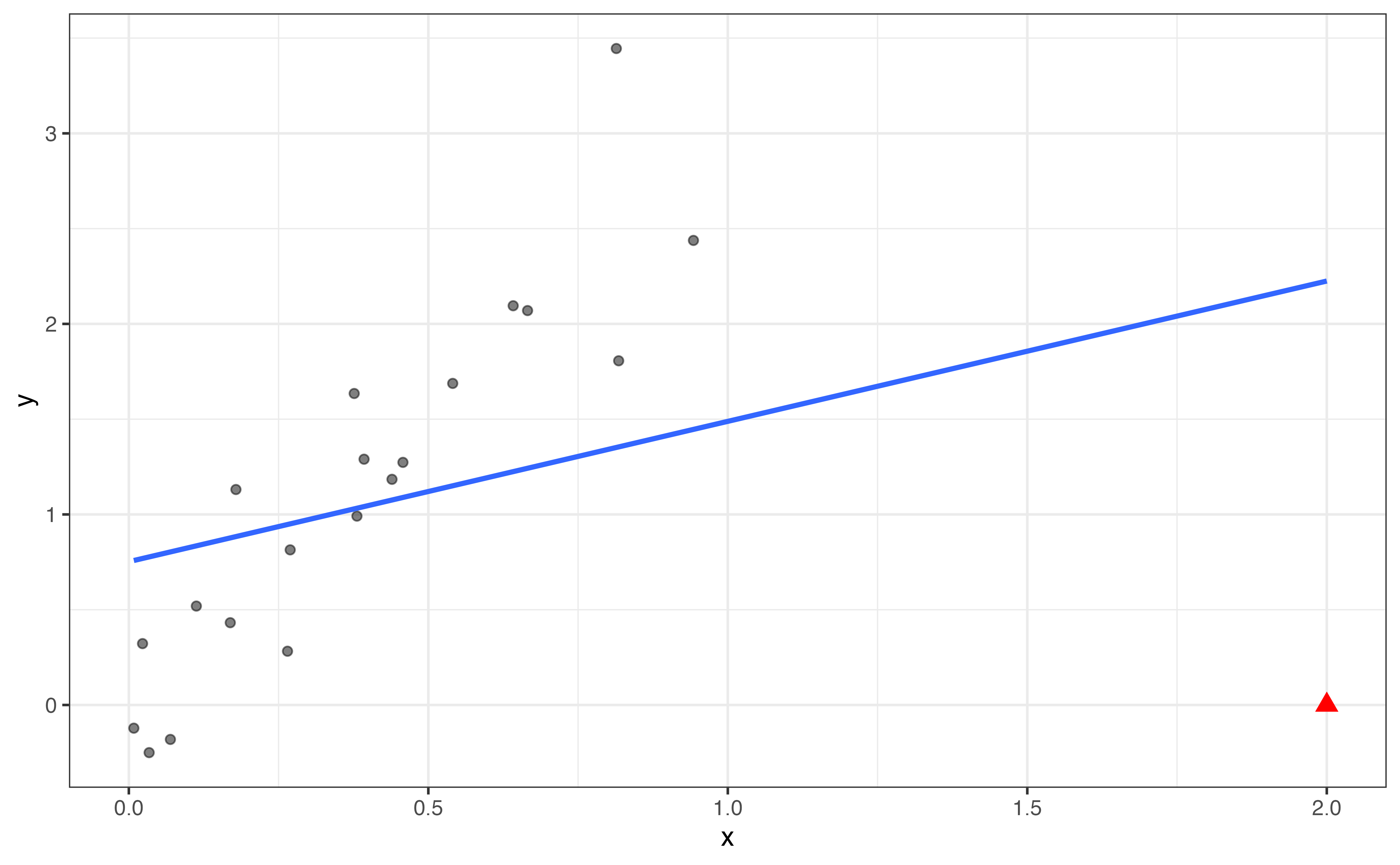 If an observation is an outlier based on the predictor variable, first consider if it is the result of a data entry error that can be fixed. If not, one option is to remove this observation from the analysis, particularly if the outlier is an influential point or a result of a data entry error. Doing so limits the scope of the conclusions that can be drawn from the analysis and the range of values for which the model can be used for prediction, because removing the outlying observation narrows the range of possible values for the predictor. When taking this approach, it is important to mention it when communicating results. Additionally, we need to be careful not to extrapolate if using the model for prediction.