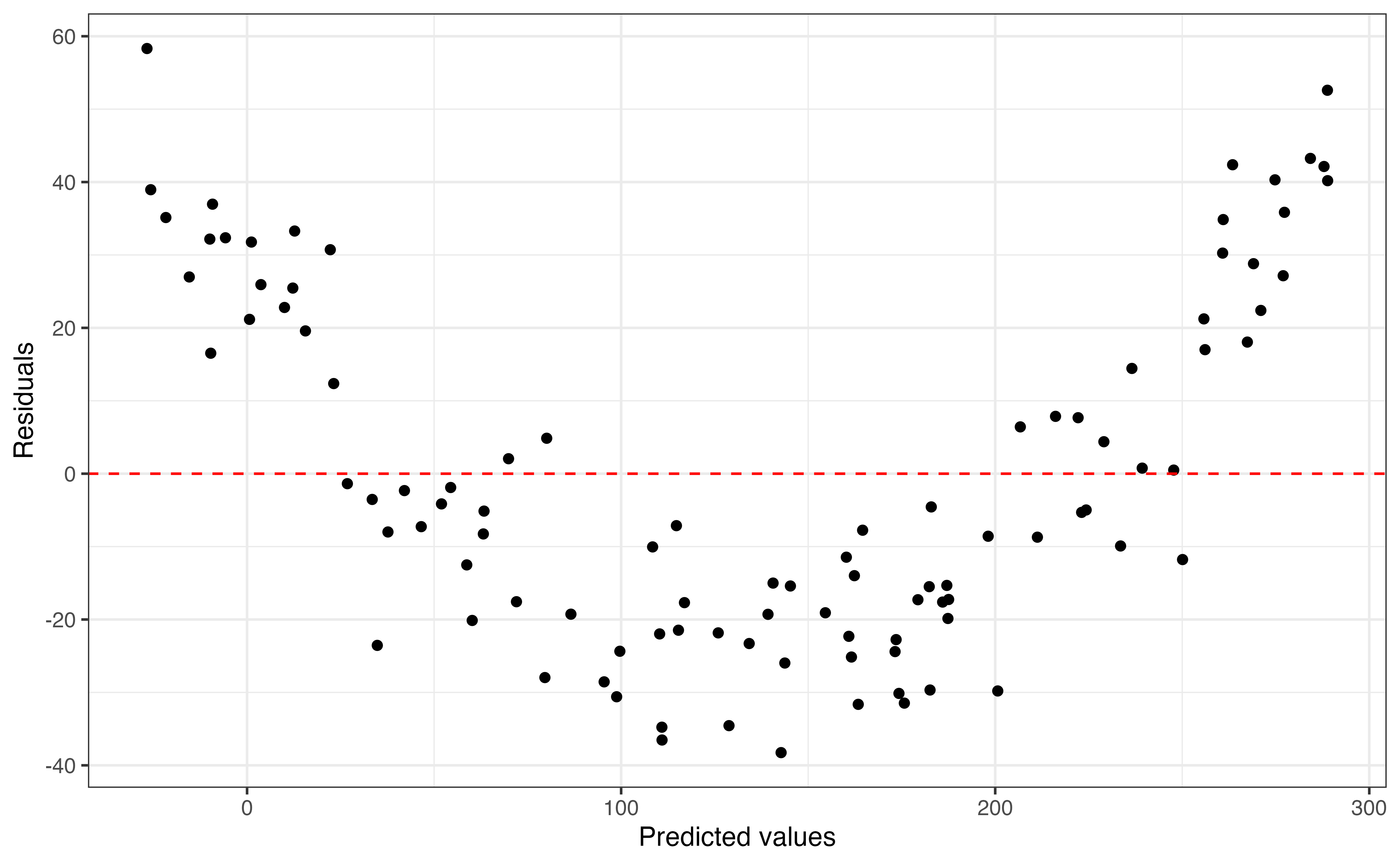 To check linearity, we make a scatterplot of the residuals versus the predicted values as shown in Figure 6.2. We have included a horizontal line at \(\text{residuals} = 0\) to more easily see when the model over or under predicts.