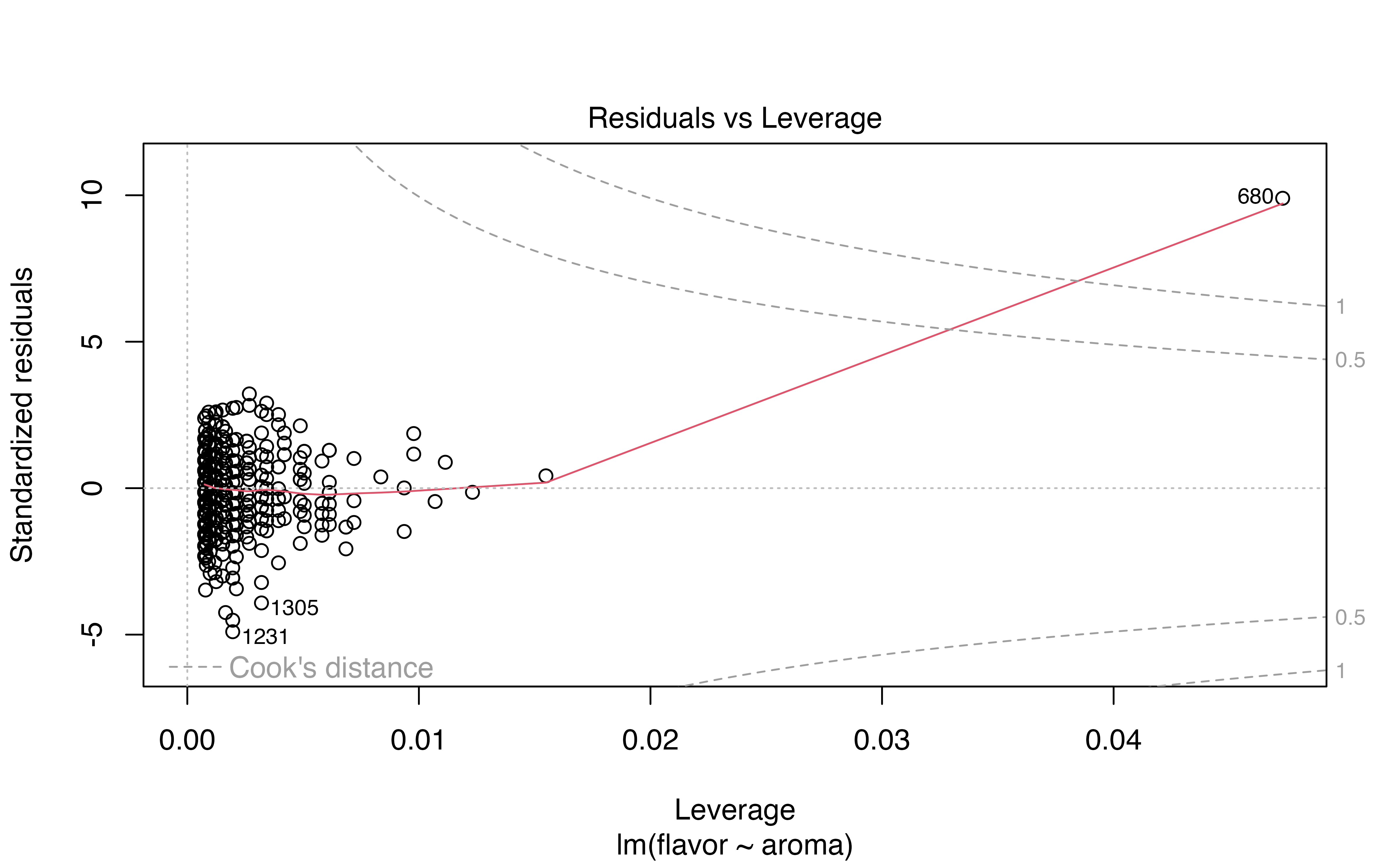 Recall that the leverage only depends on the values of the predictor variable, so we only need to consider aroma to better understand why these points are large leverage. From the EDA in Section 6.1, the average aroma grade in the data set is 7.572 points and the standard deviation is 0.316 . The observations with the largest values of leverage have aroma grades that are either much higher (e.g., 8.75) or much lower (e.g., 5.08) than the average. Thus the large leverage points includes coffees that both smell much better and perhaps much worse than the majority of the coffees in the data.