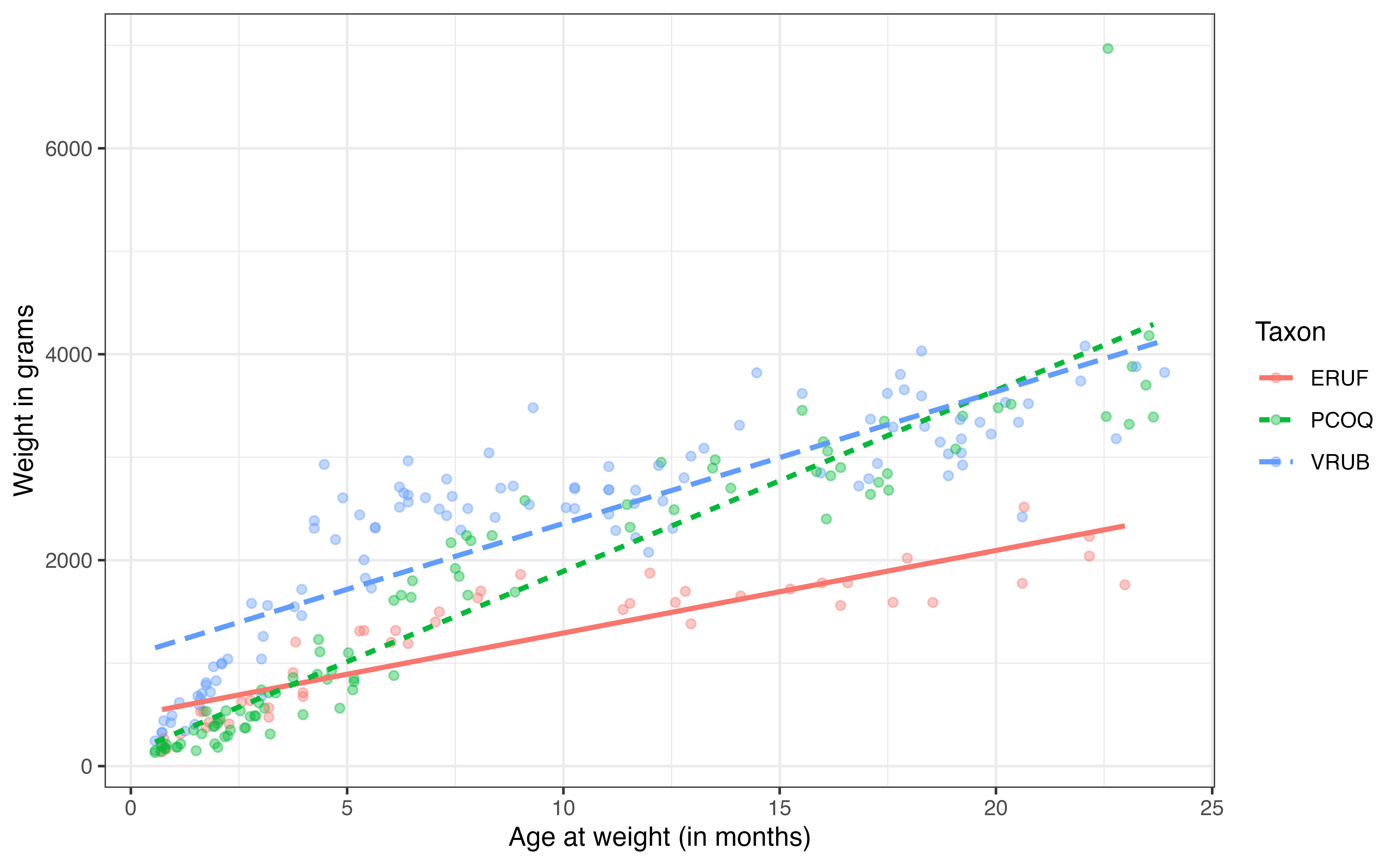 weight: Weight of the lemur (in grams)taxon: Code made as a combination of the lemur’s genus and species. Note that the genus is a broader categorization that includes lemurs from multiple species. This analysis focuses on the following taxon:ERUF: Eulemur rufus, commonly known as Red-fronted brown lemurPCOQ: Propithecus coquereli, commonly known as Coquerel’s sifakaVRUB: Varecia rubra, commonly known as Red ruffed lemur