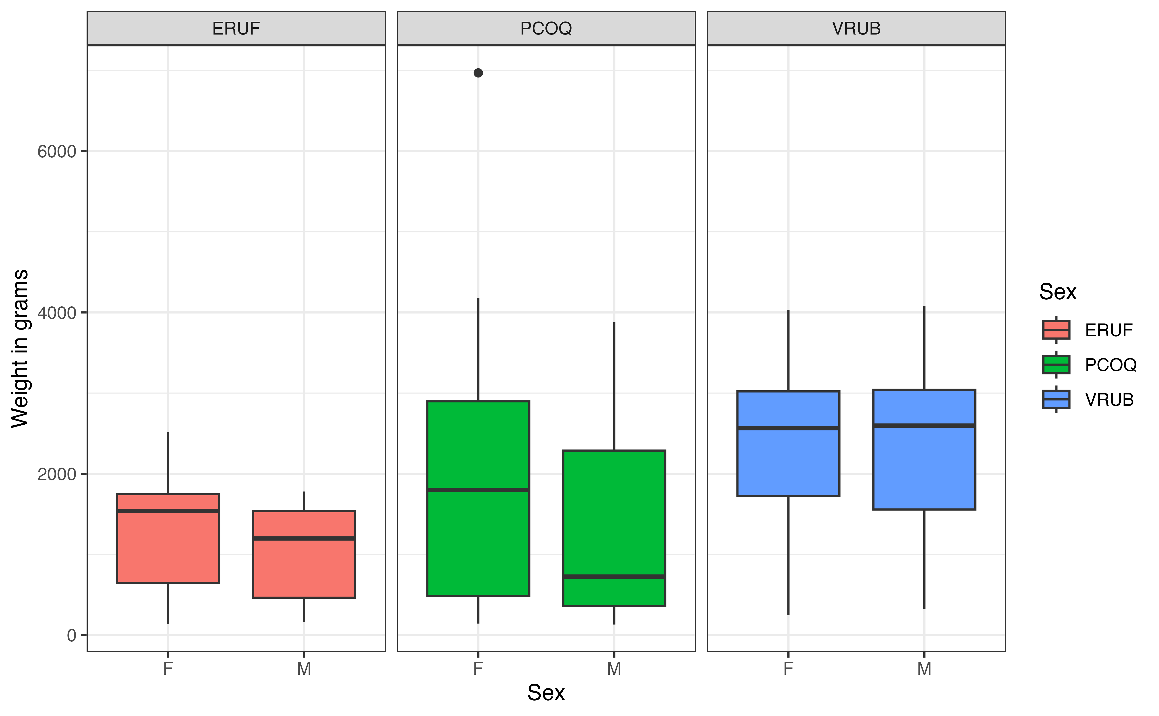 In Figure 7.4 (b), lemurs from the PCOQ taxon have a lower median weight than lemurs from ERUF or VRUB: however, there is a lot of overlap in the distribution of weights of ERUF and PCOQ lemurs. Lemurs in the VRUB taxon have the highest median weight; however, the middle 50% of the distribution overlaps greatly with the distribution for PCOQ lemurs. There is more variability in the weights of PCOQ lemurs compared to ERUF and VRUB, and we see the lemur with the outlier weight is in the PCOQ taxon.