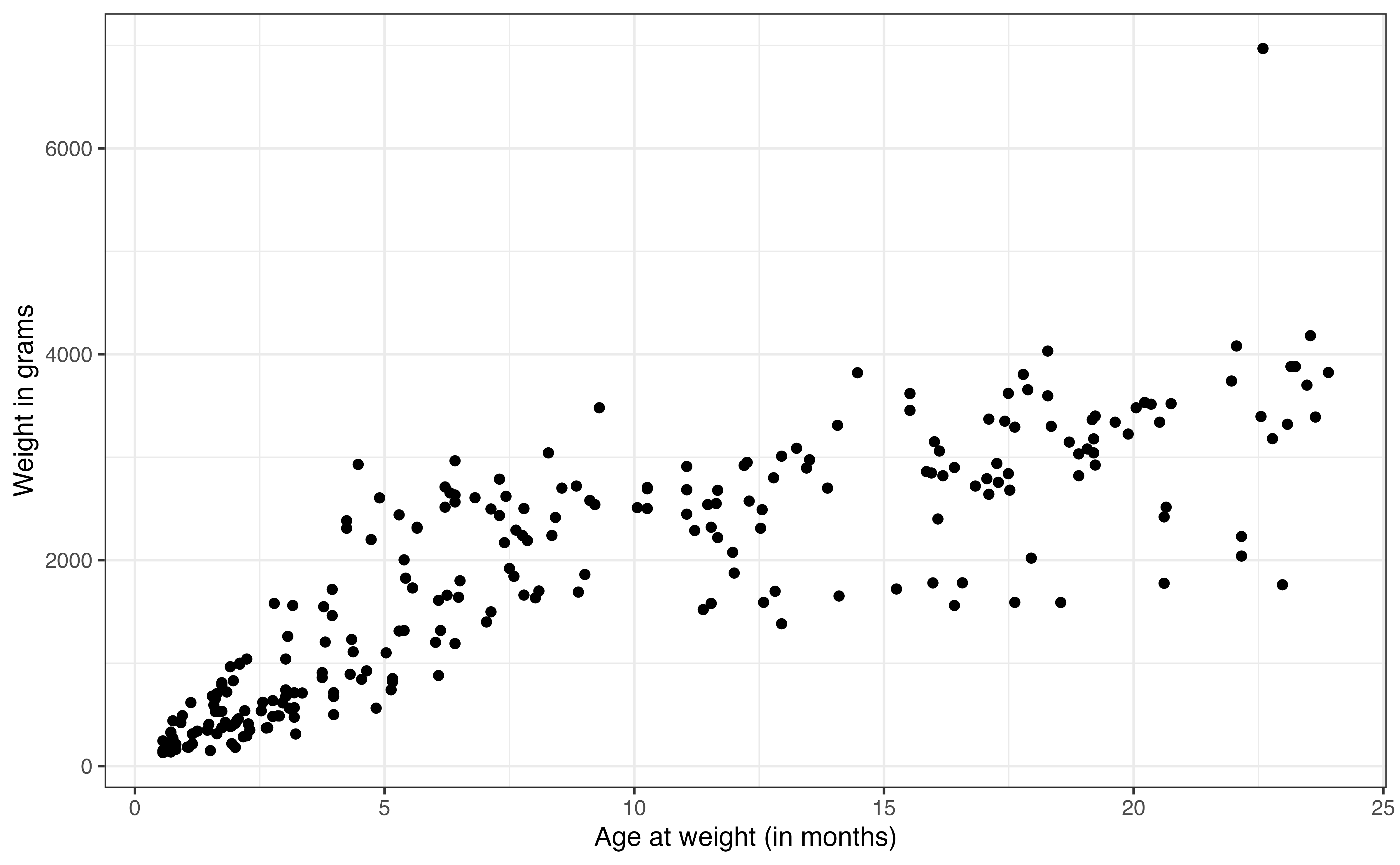 From Figure 7.4 (a), we see a strong, positive relationship between age and weight. The relationship looks linear; however, the relationship flattens as age increases. This aligns with what we might expect; lemurs experience fairly rapid growth early on, and then their growth rate slows over time. In Chapter 9, we will introduce transformations that can be applied to the predictor and response variables to account for such trends in the model. For now, we will model the relationship as a constant rate of change between age and weight.