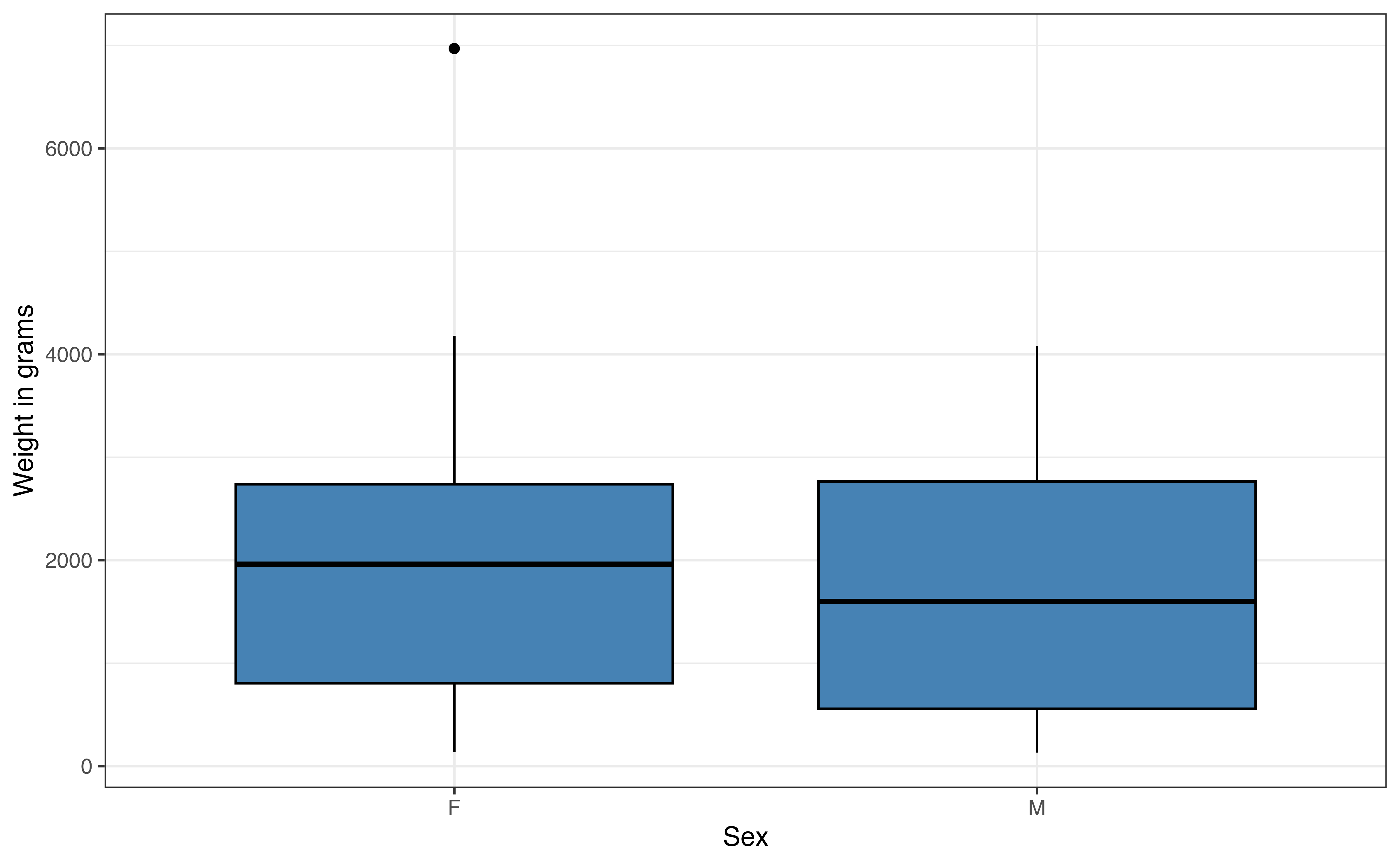 Based on the medians and large overlap in the boxplots in Figure 7.4 (c), there does not appear to be much difference in the weights of male and female lemurs. From this plot, we see the lemur with the high outlying weight is a female.