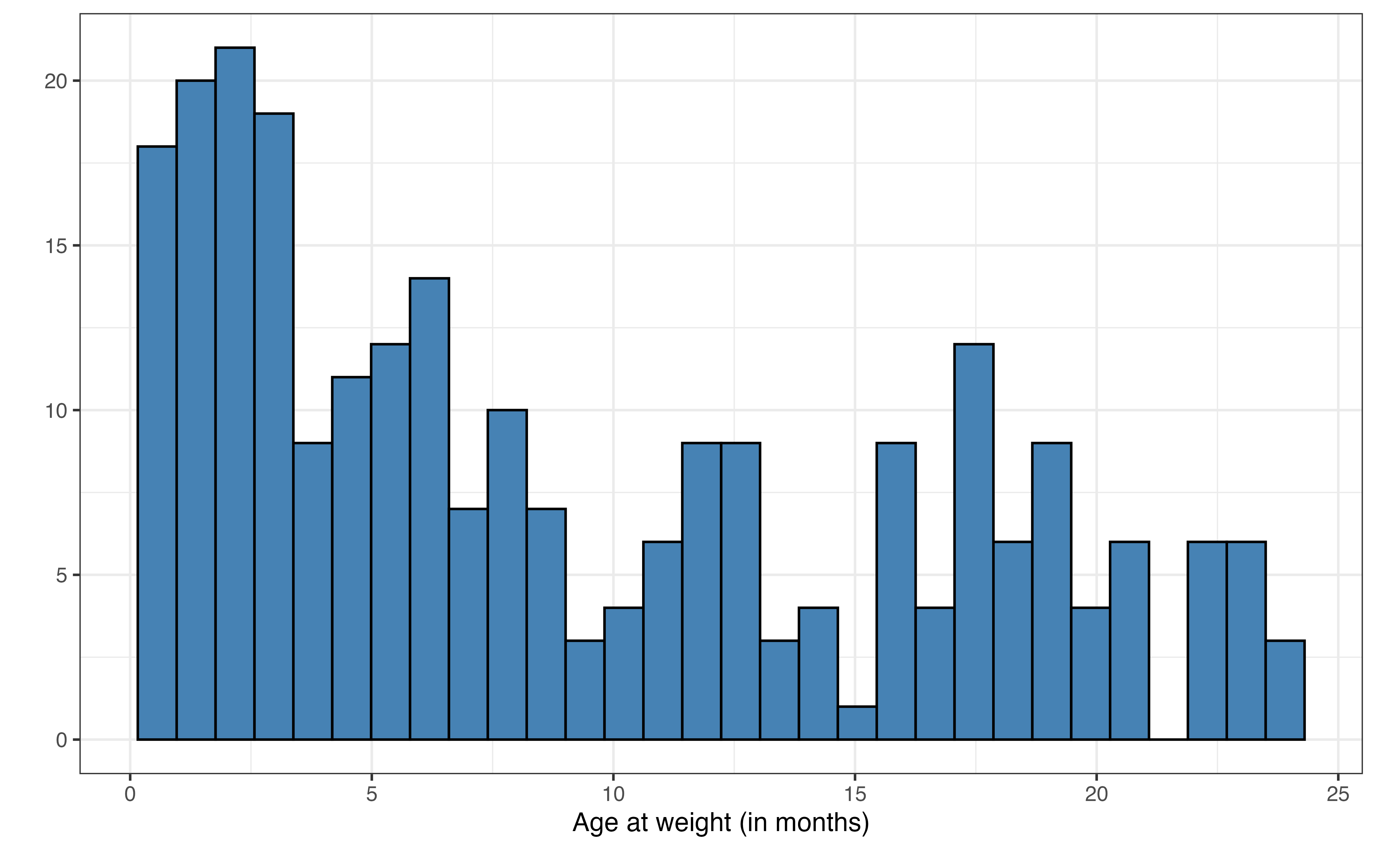 ageis unimodal and skewed right, so the center is best described by the median 7.1 months and spread by the IQR of 12.8 months. There does not appear to be any outliers for age in the data.↩︎It is possible to fit models such that