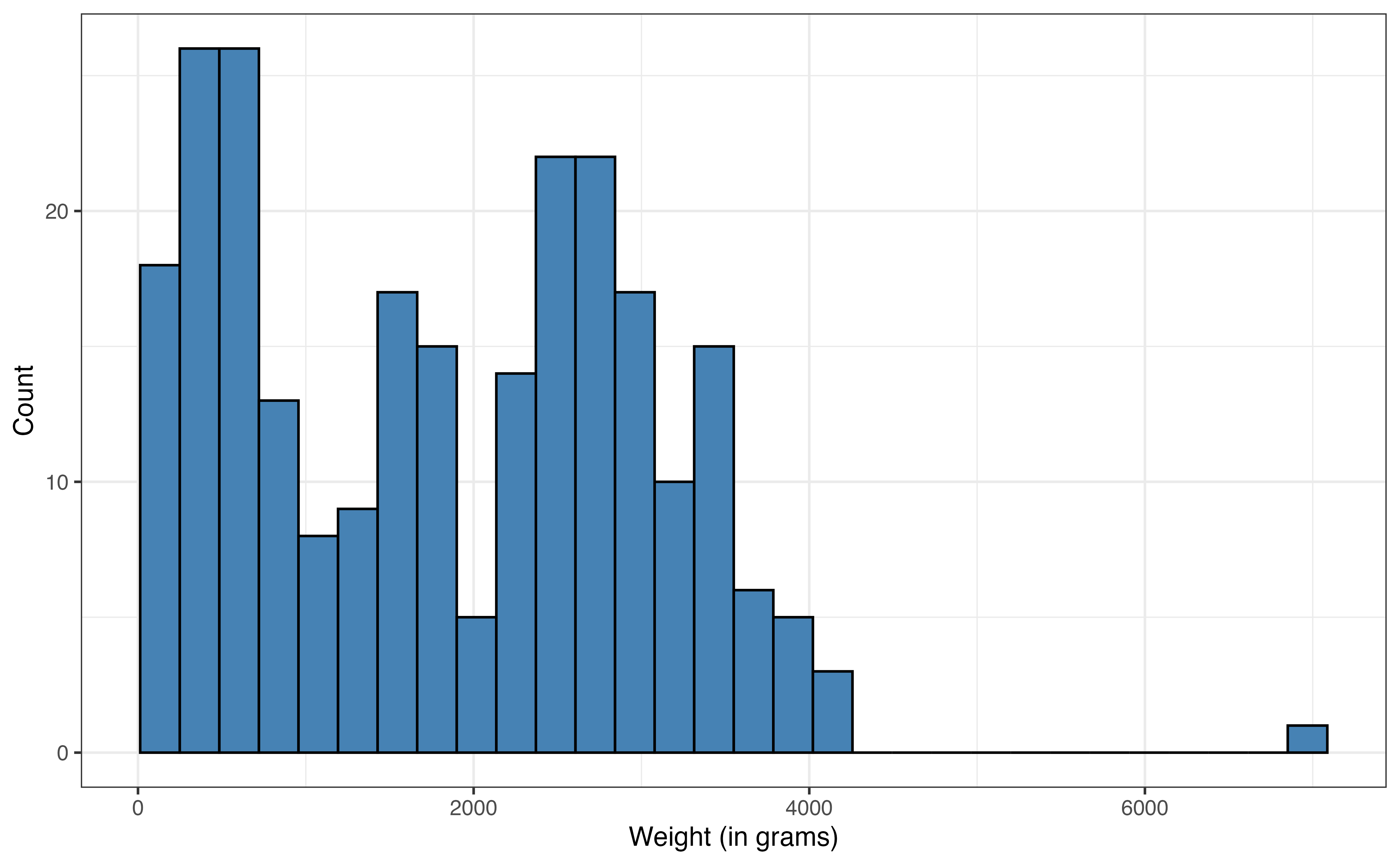 The distribution and summary statistics for the response variable weight are shown in Figure 7.2 and Table 7.1, respectively. The center of the distribution is around the median of 1779.5 grams and the interquartile range (IQR) is 2087 grams. The distribution is bimodal, which may be due to the multiple taxa represented in the data. There is one lemur with a high outlying weight of 6969 grams. We will keep the bimodality and outlier in mind as we proceed with the analysis.