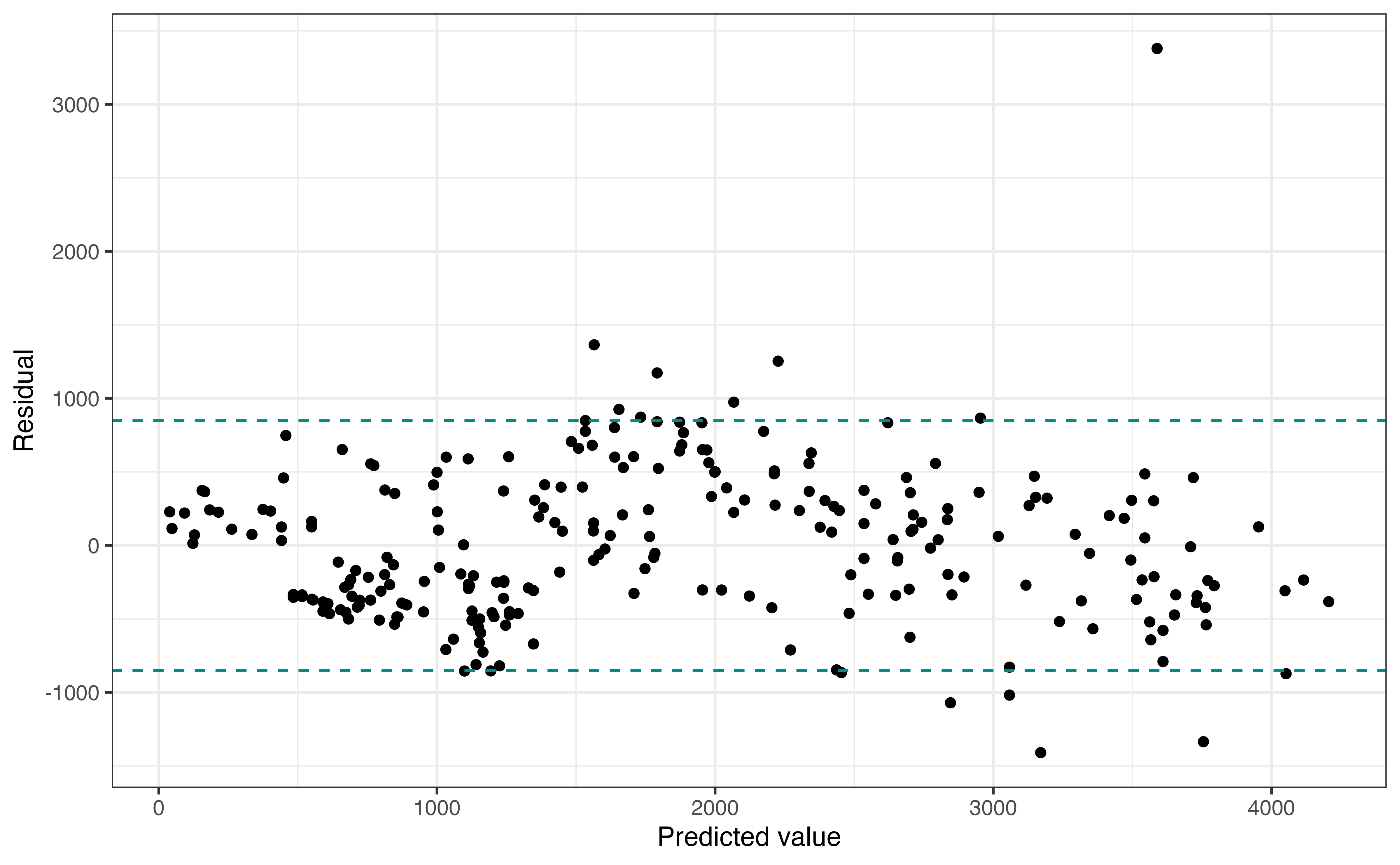 Figure 8.7 shows a plot of th residuals versus predicted values, similar to Figure 8.4. As we move along the \(x\)-axis, we are looking to see if the vertical spread is approximately equal for all observations. To help evaluate this, we have added vertical lines encompassing the majority of the data. Note as we move along the \(x\)-axis, the vertical spread fo the residuals is largely captured in by these vertical lines. Thus, the equal variance condition is satisfied. As with other conditions, we can ignore the high outlier when assessing the condition. Additionally, we are looking for noticeable violations in the conditions rather than perfect adherence when making the determination.