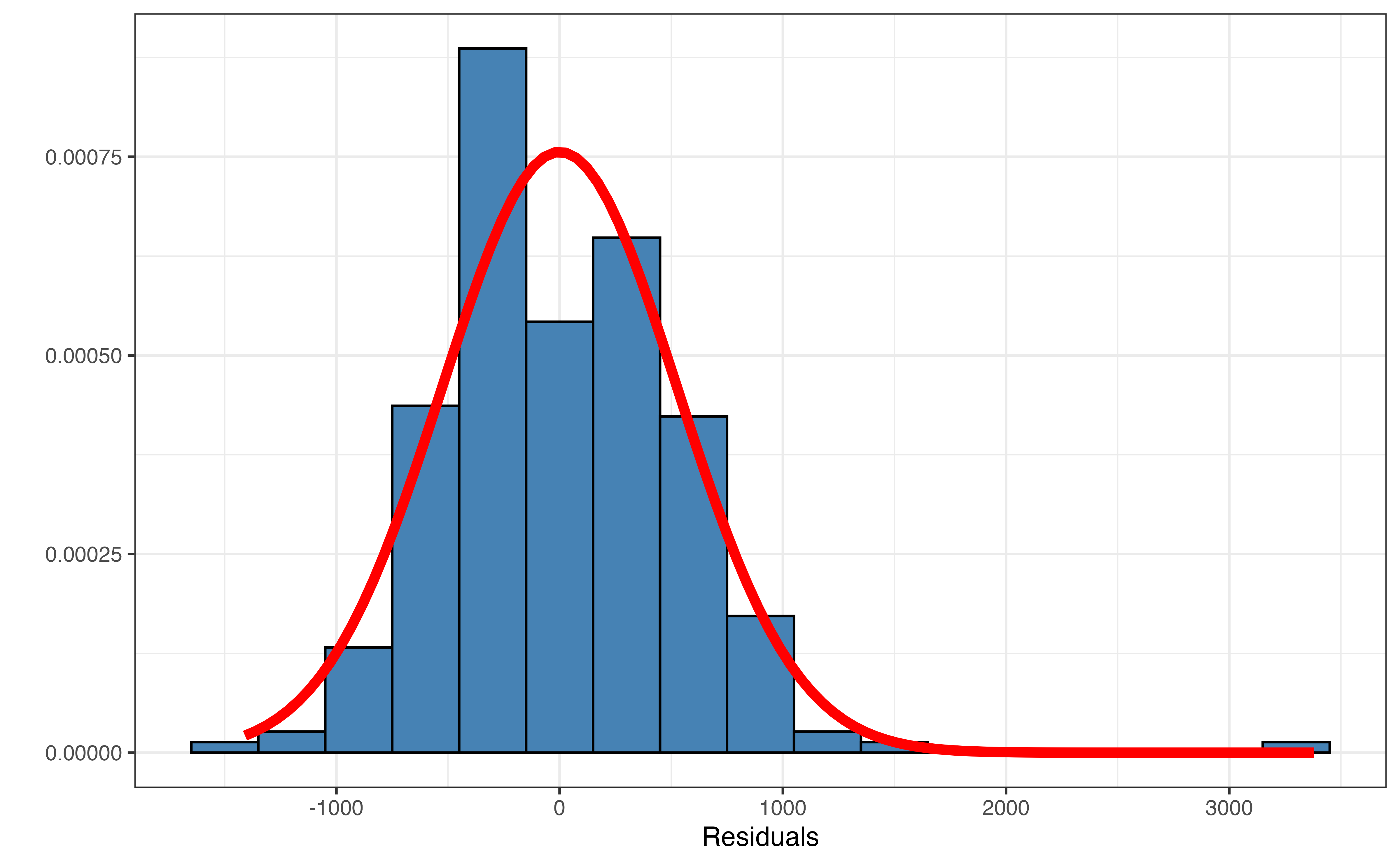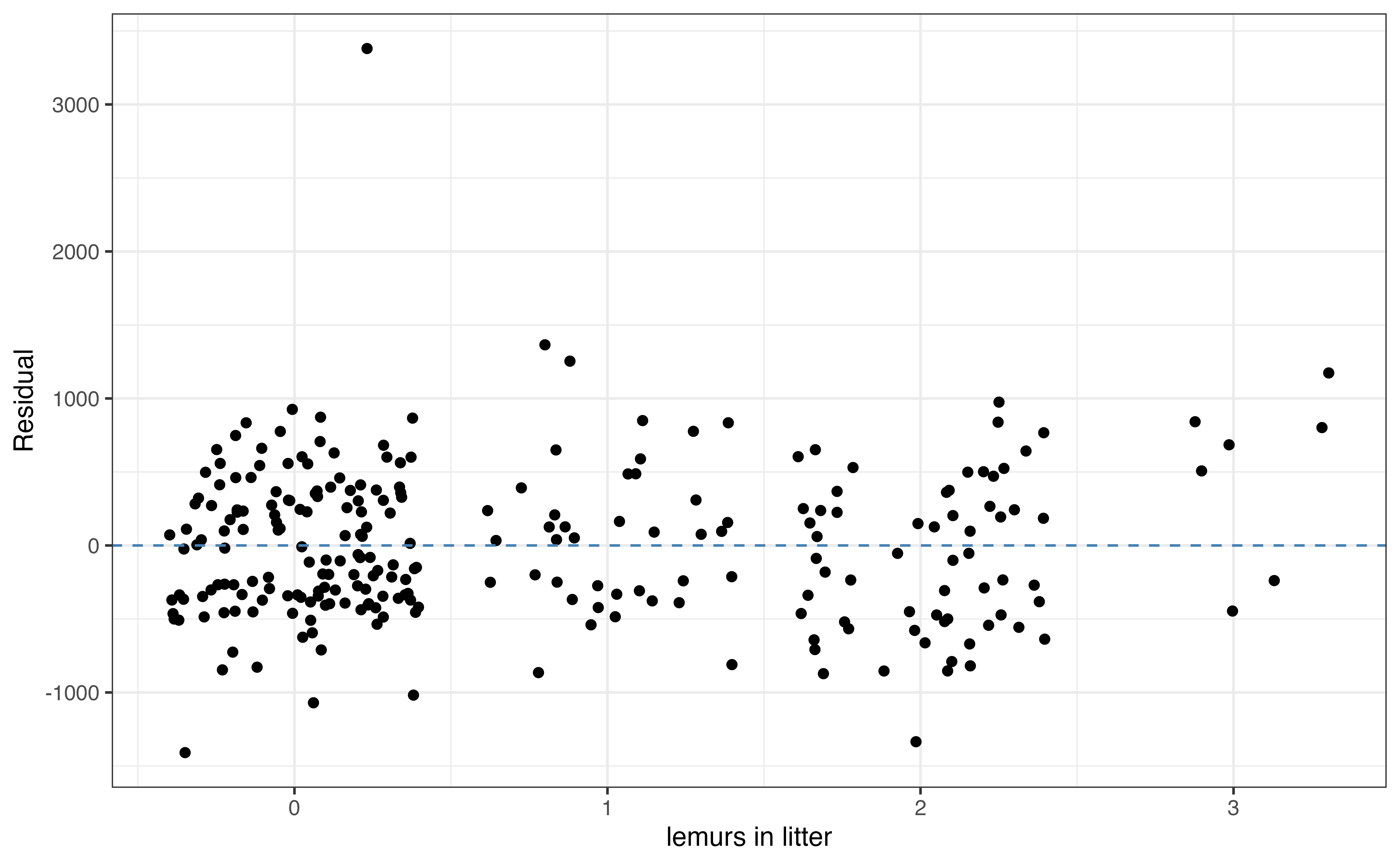 The residual means that the observed weight for this lemur is 3380.42 grams greater than the weight predicted by the model. The standardized residual means that the residual for this observation is 6.442standard errors above the mean of the distribution of residuals.↩︎