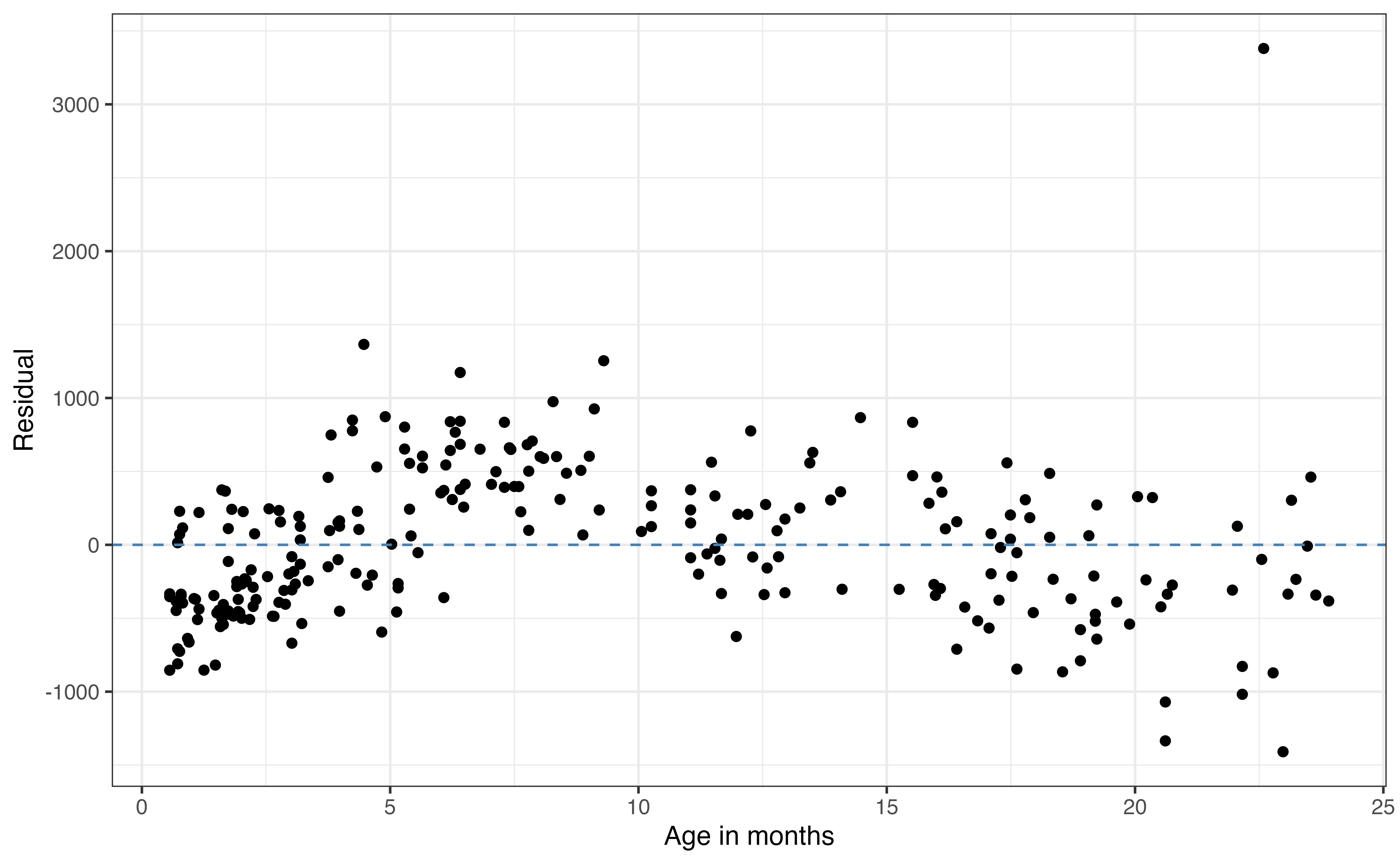 The final model condition in LINE is the equal variance condition. This condition comes from the assumption about the distribution of the error terms, \(\epsilon_i \sim N(0, \sigma^2_{\epsilon})\), that the variance in this distribution, \(\sigma^2_{\epsilon}\) is the same for all observations regardless of the values of the predictors. Thus, the variability of the residuals should be the same for all predicted values (combinations of predictors).