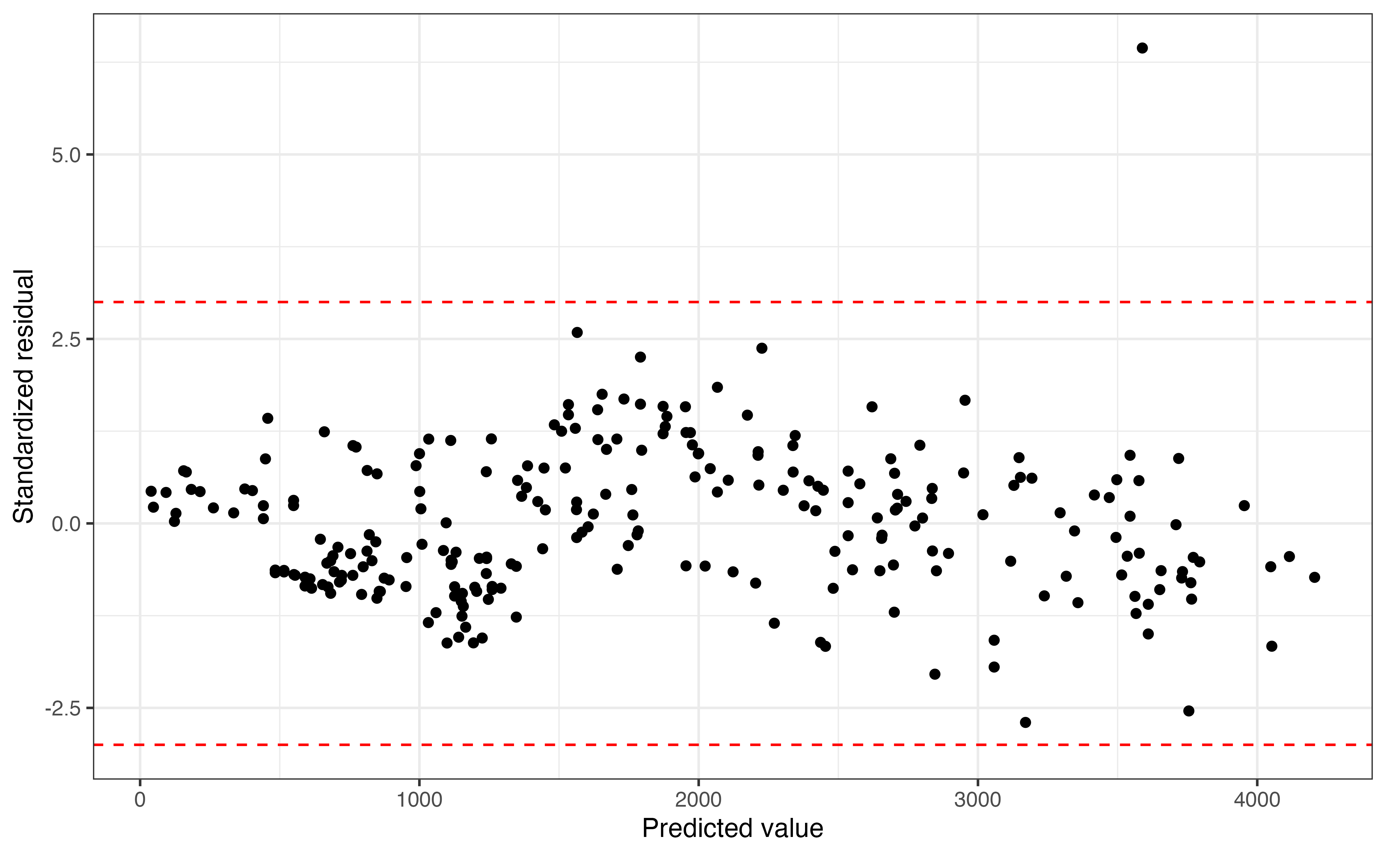 Figure 8.10 shows the standardized residuals versus predicted values, with lines at -3 and 3, the thresholds for identifying outliers. There is one observation that is an outlier in the \(Y\) direction with a standardized residual of 6.442. Though this observation is a noticeable outlier in the model performance, it is not an influential point based on Cook’s distance computed earlier.