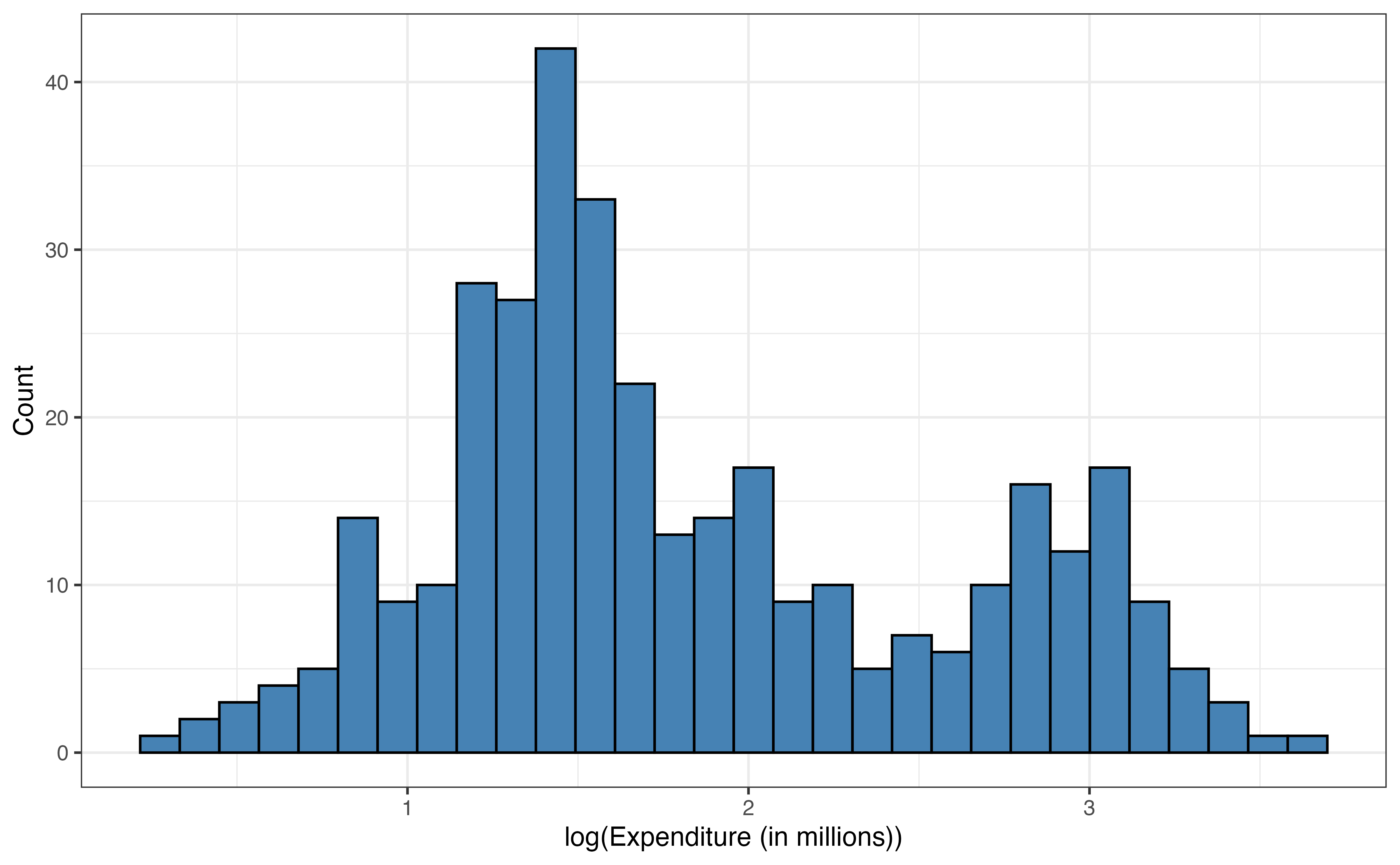 Let’s begin by looking at the distribution of log(expenditure_m), its relationship with enrollment_th, and how these compare to the exploratory data analysis in Section 9.1.