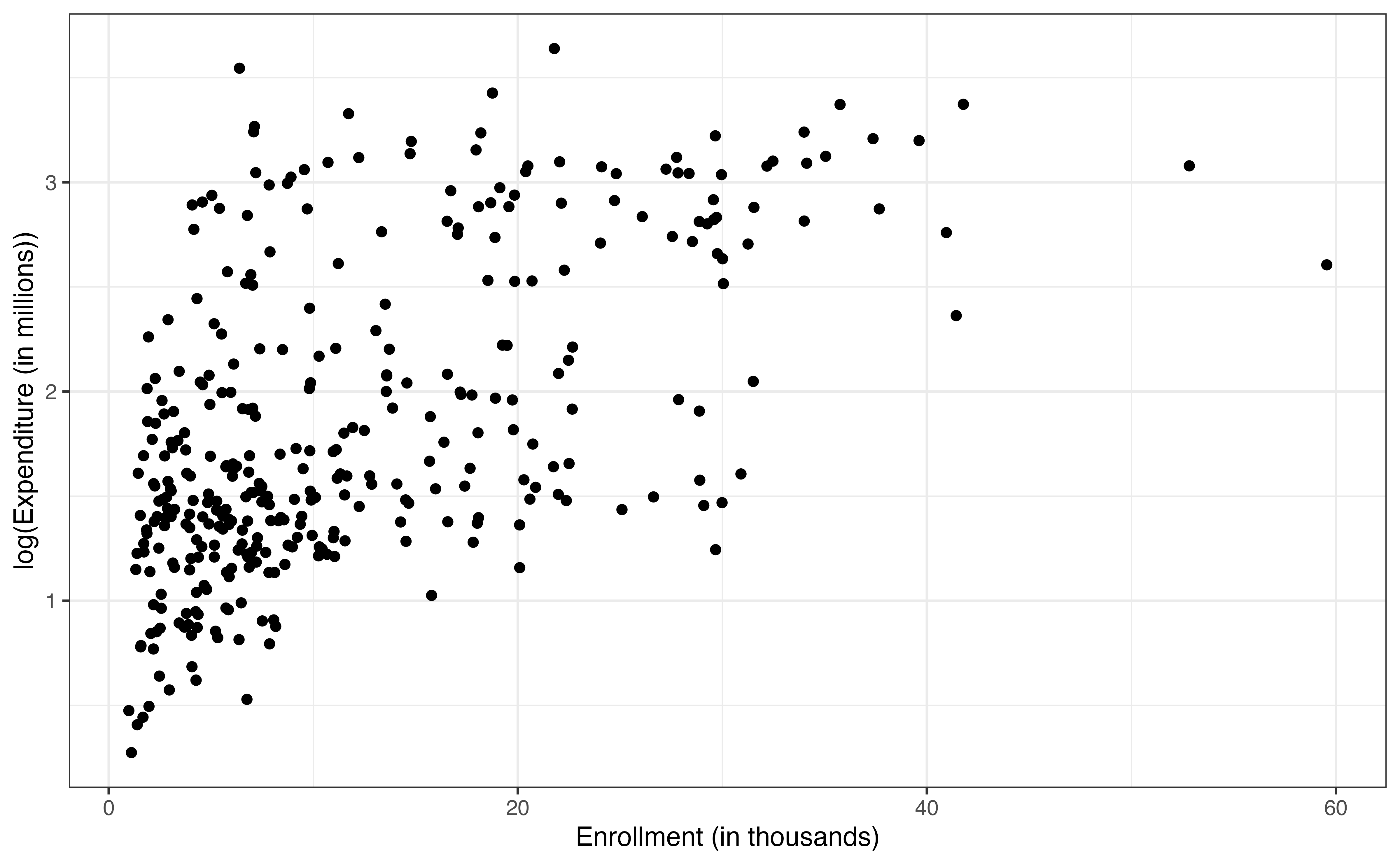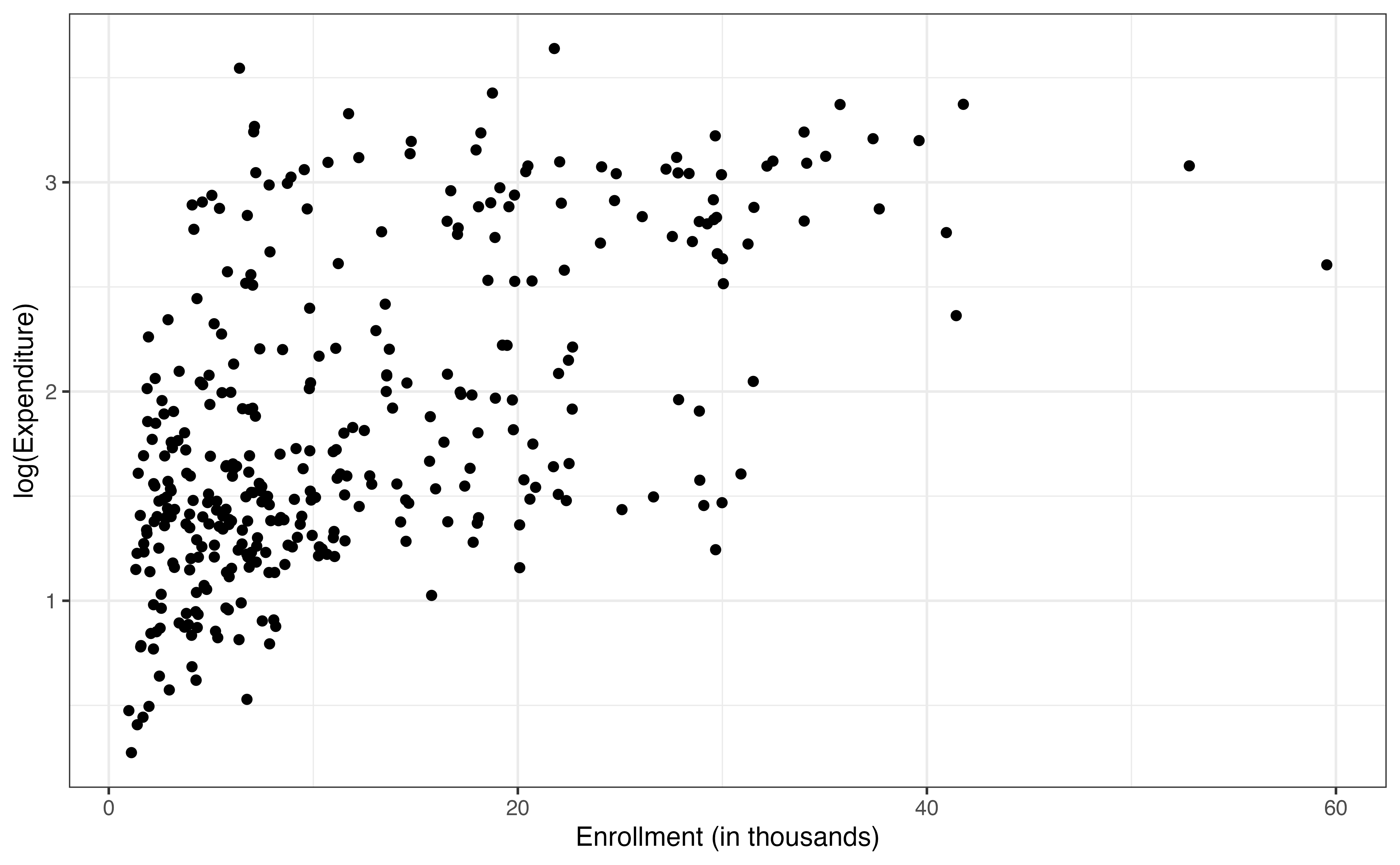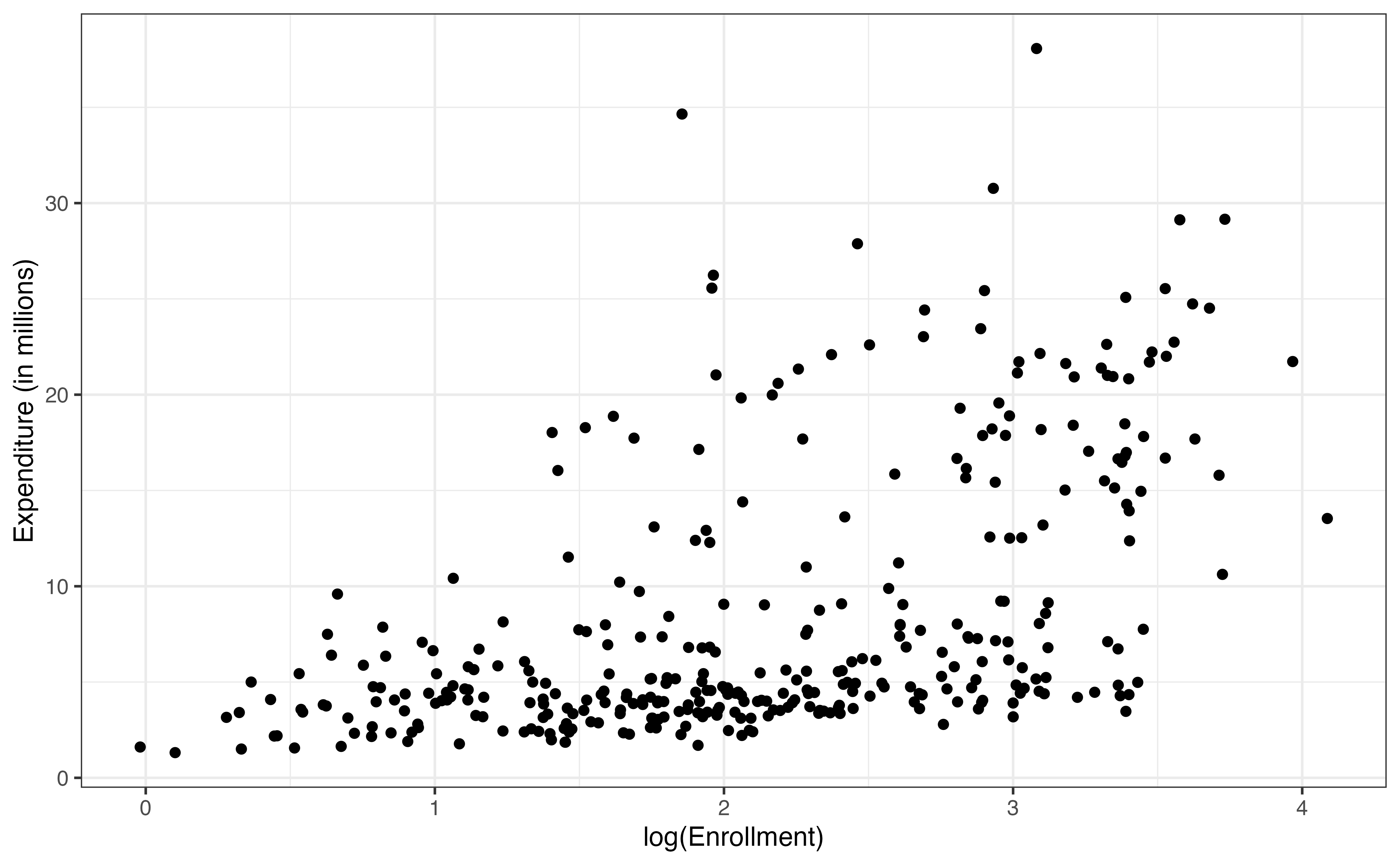 enrollment_thandtype. The slope of the relationship betweenenrollment_thandexpenditureappears to be different based on the type of college.↩︎From the figure, it appears Figure 9.6 (d) with with a log transformation on both