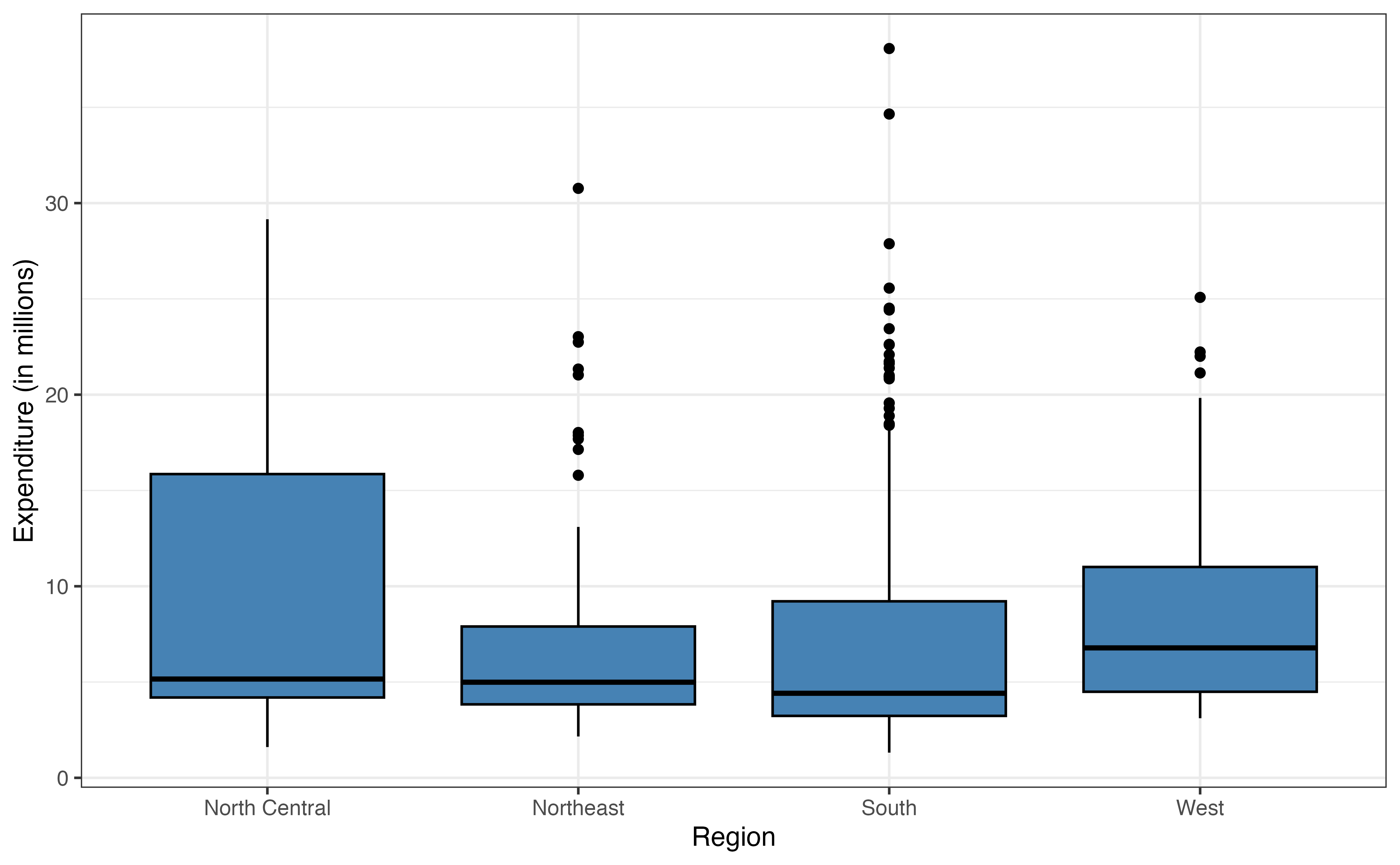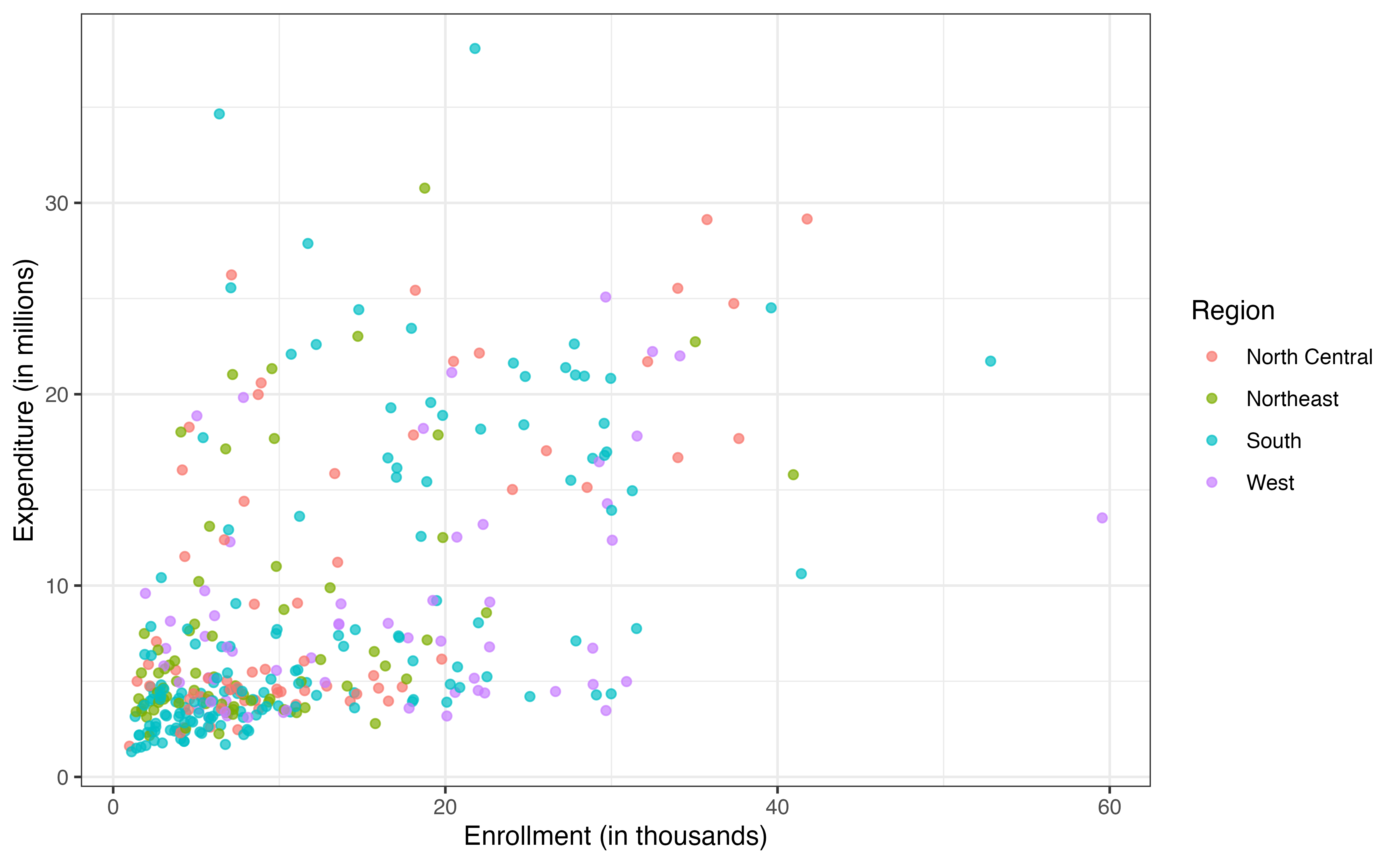 expenditure_m: Total expenditure on basketball programs (in millions of US dollars)enrollment_th: Total student enrollment (in thousands)type: Whether the college is public or privateregion: Region where the college is located. The regions are defined using thestate.regionvector in R.