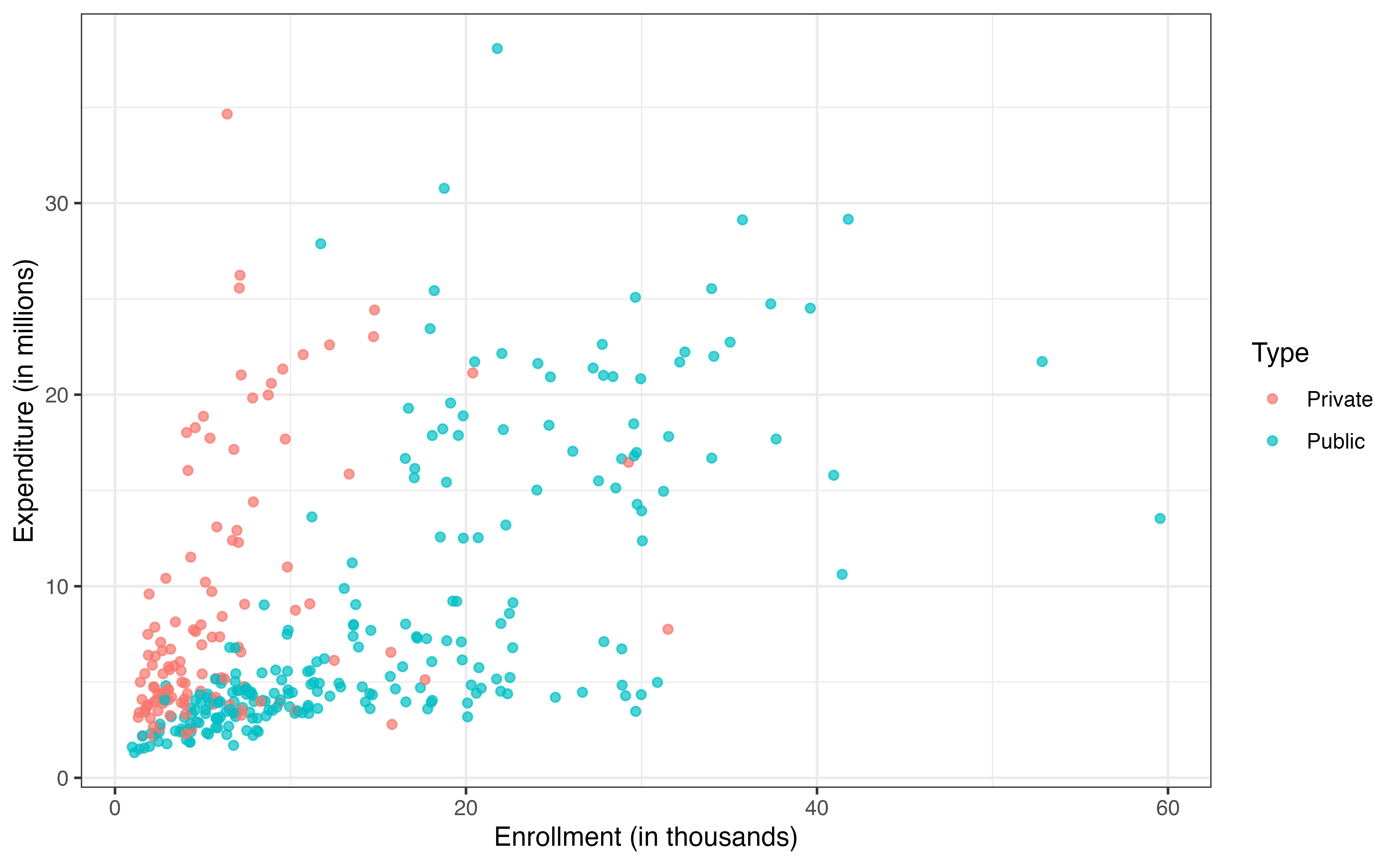For example, let’s consider how the average expenditure differs between public and private colleges for colleges with 5000 students. Assume region is the same.