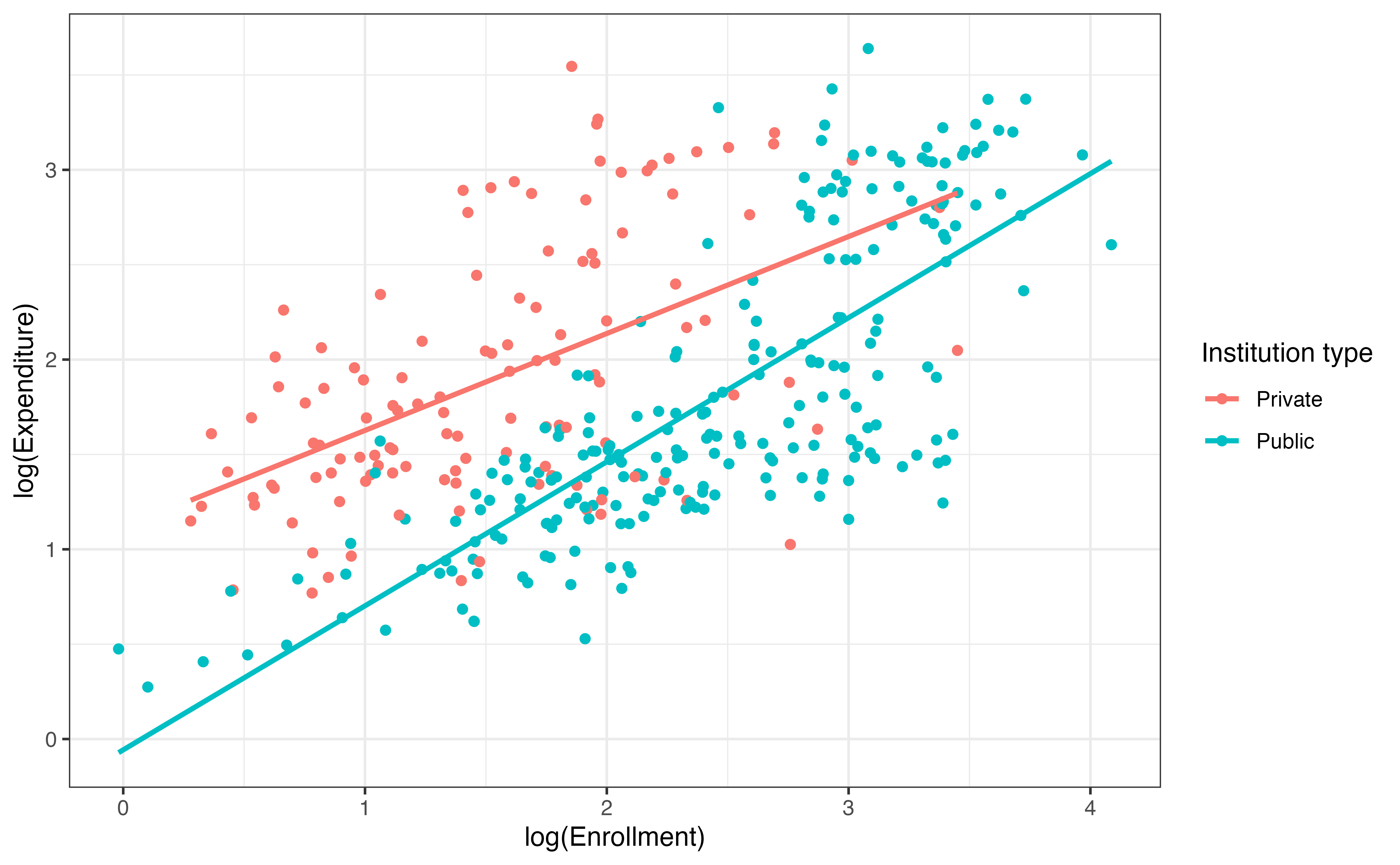 The plot shows that there may be an interaction effect, because the slope of the relationship between log(expenditure_m) and log(enrollment_th) is steeper for public colleges than for private colleges. Given this plot, we include the interaction term to the model selected in Section 9.5. The output is in Table 9.7.