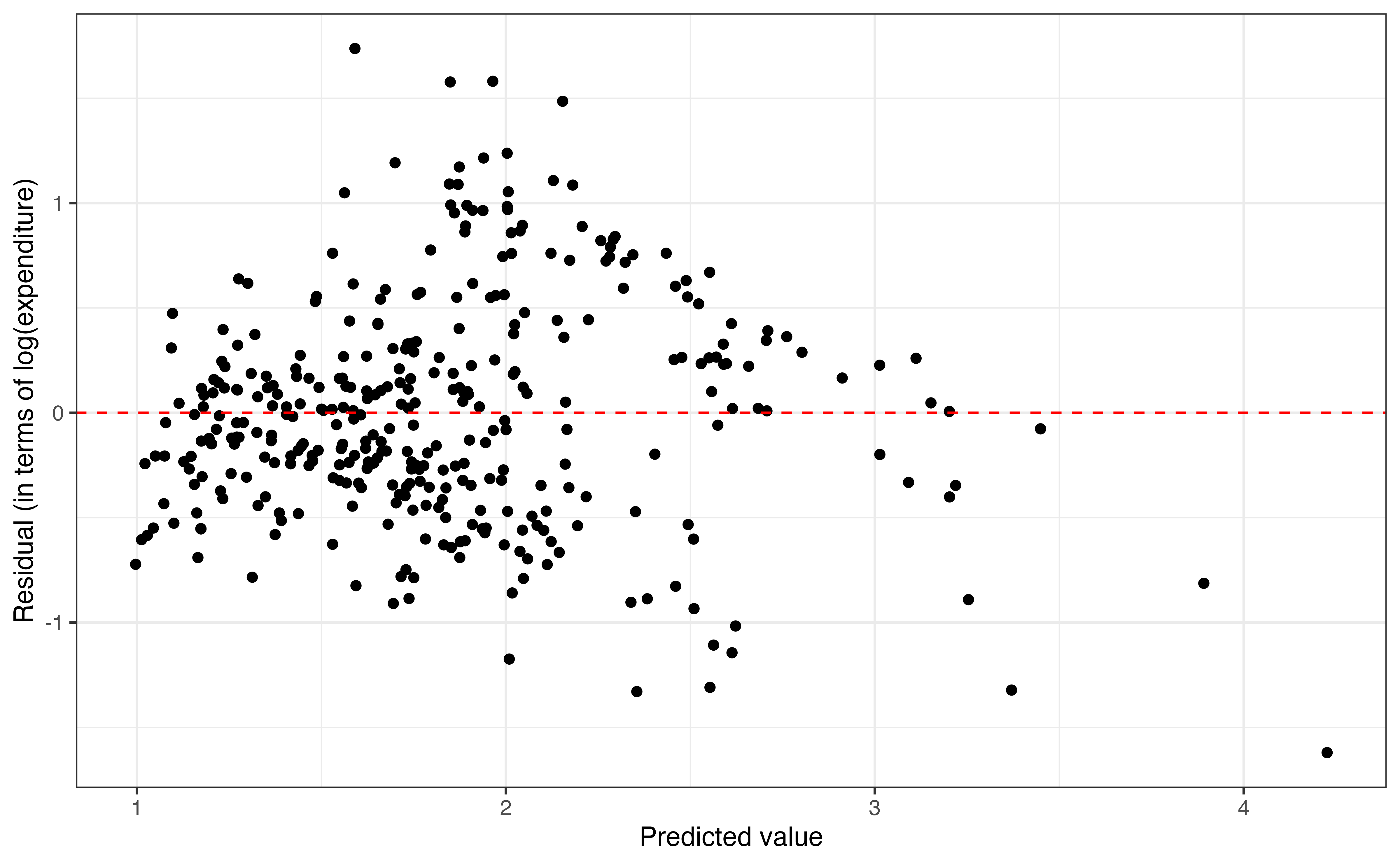 Comparing the plots in Figure 9.8, the first observation is that the \(y\)-axis differs on the plots. This is the because the residuals are on the same scale and use the same units as the response variable. The residuals in Figure 9.8 (a) are in terms of the original variable expenditure_m, and the residuals in Figure 9.8 (b) are in terms of log(expenditure_m). The same is true for the predicted values on the \(x\)-axis. The second observation is that the vertical spread of the residuals is much more equal Figure 9.8 (b) with the log-transformed response variable. Given this, it appears applying a log transformation on the response variable has addressed some of the problems with the equal variance condition.