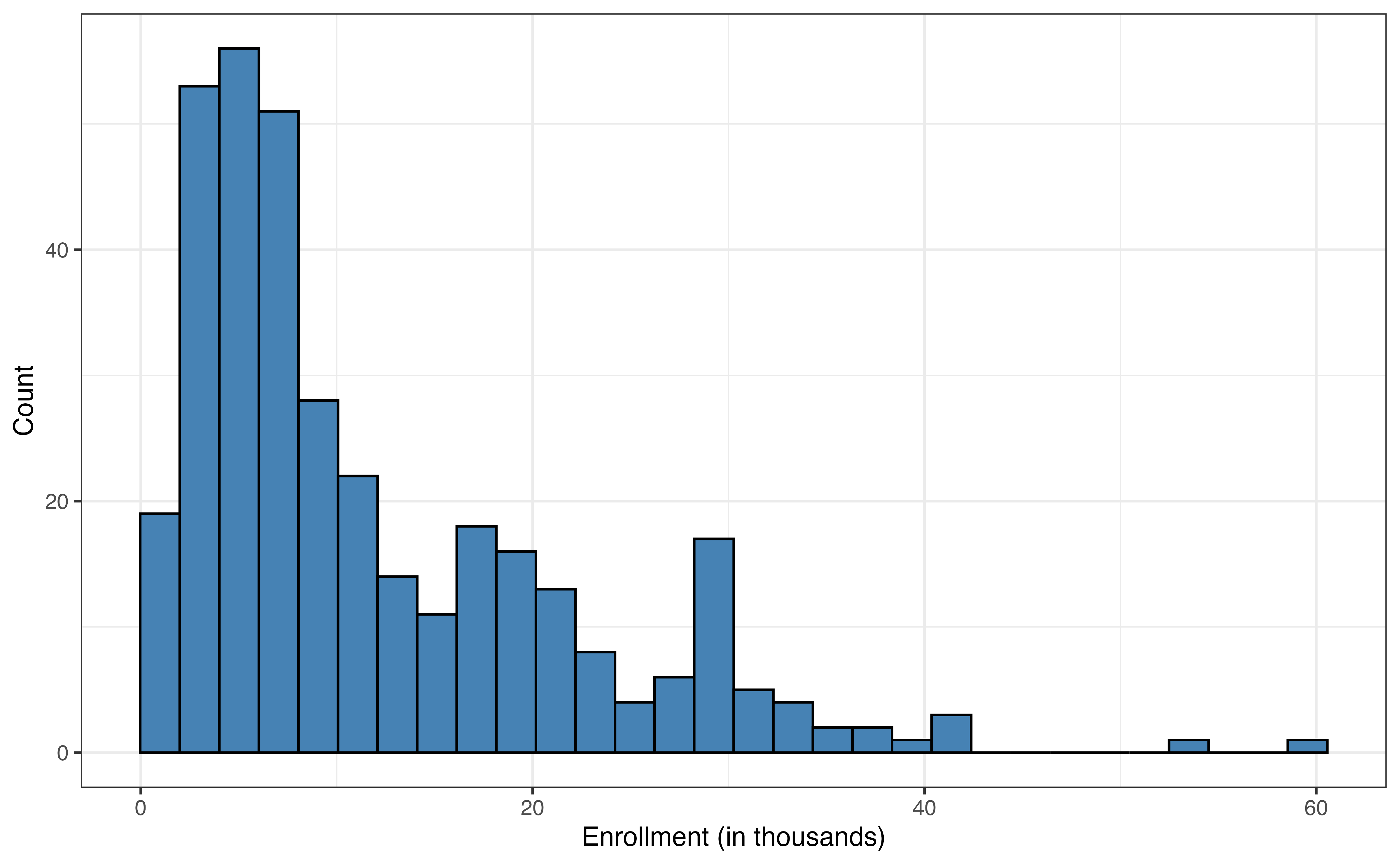 The response variable expenditure_m in Figure 9.1 is unimodal and skewed right. The median expenditure on basketball programs is 5 million dollars, but there are a few colleges that spent over 30 million dollars on basketball programs in 2023 - 2024. Similarly, enrollment_th in Figure 9.2 (a) is unimodal and skewed right, with a median enrollment of about 7900 students. There are some very large colleges in the data set with enrollments of over 40,000 students.