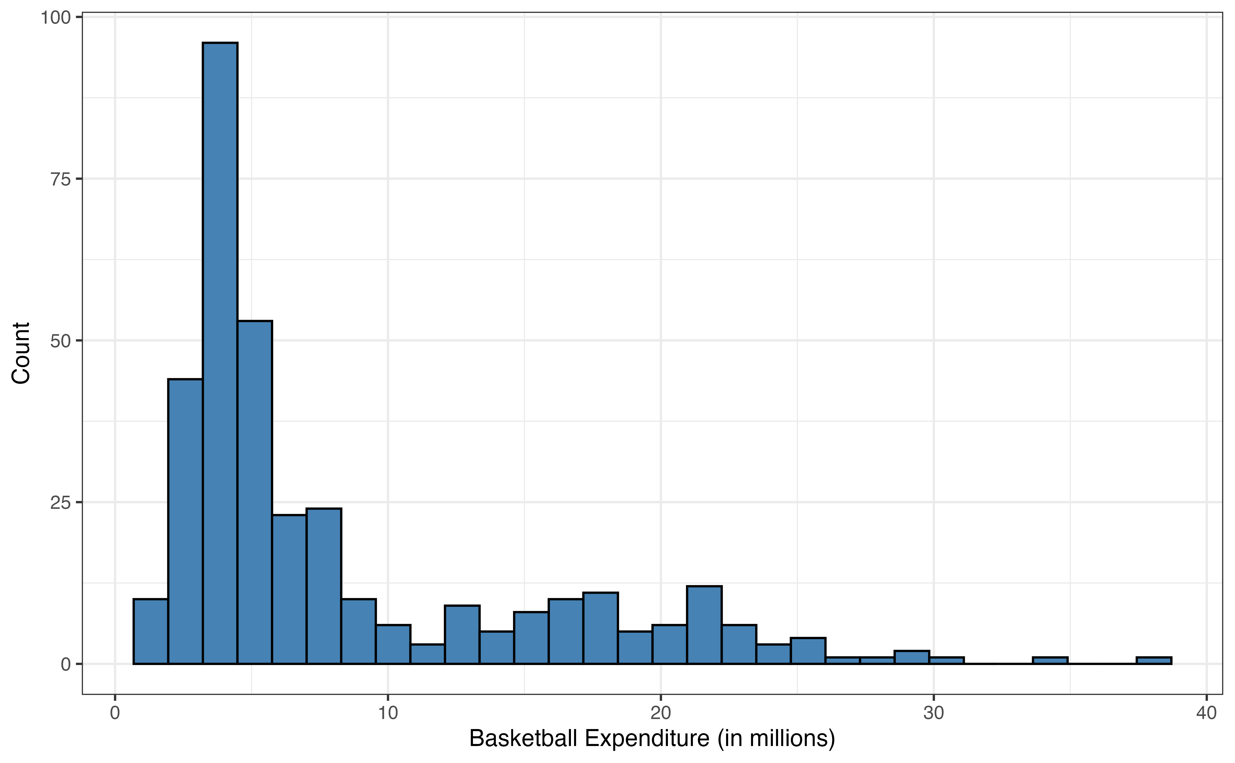 The analysis in this chapter focuses on the amount of money colleges and universities spend in total on men’s and women’s basketball programs in a single year. The data come from the Equity in Athletics Data Analysis (EADA) tool from the Office of Postsecondary Education in the United States Department of Education (ope.ed.gov/athletics). Every college and university in the United States that offers both student financial aid and intercollegiate programs (this includes nearly all colleges and universities) are required by law to submit information about its spending and revenue on athletic programs annually (U.S. Department of Education, Office of Postsecondary Education 2025).
