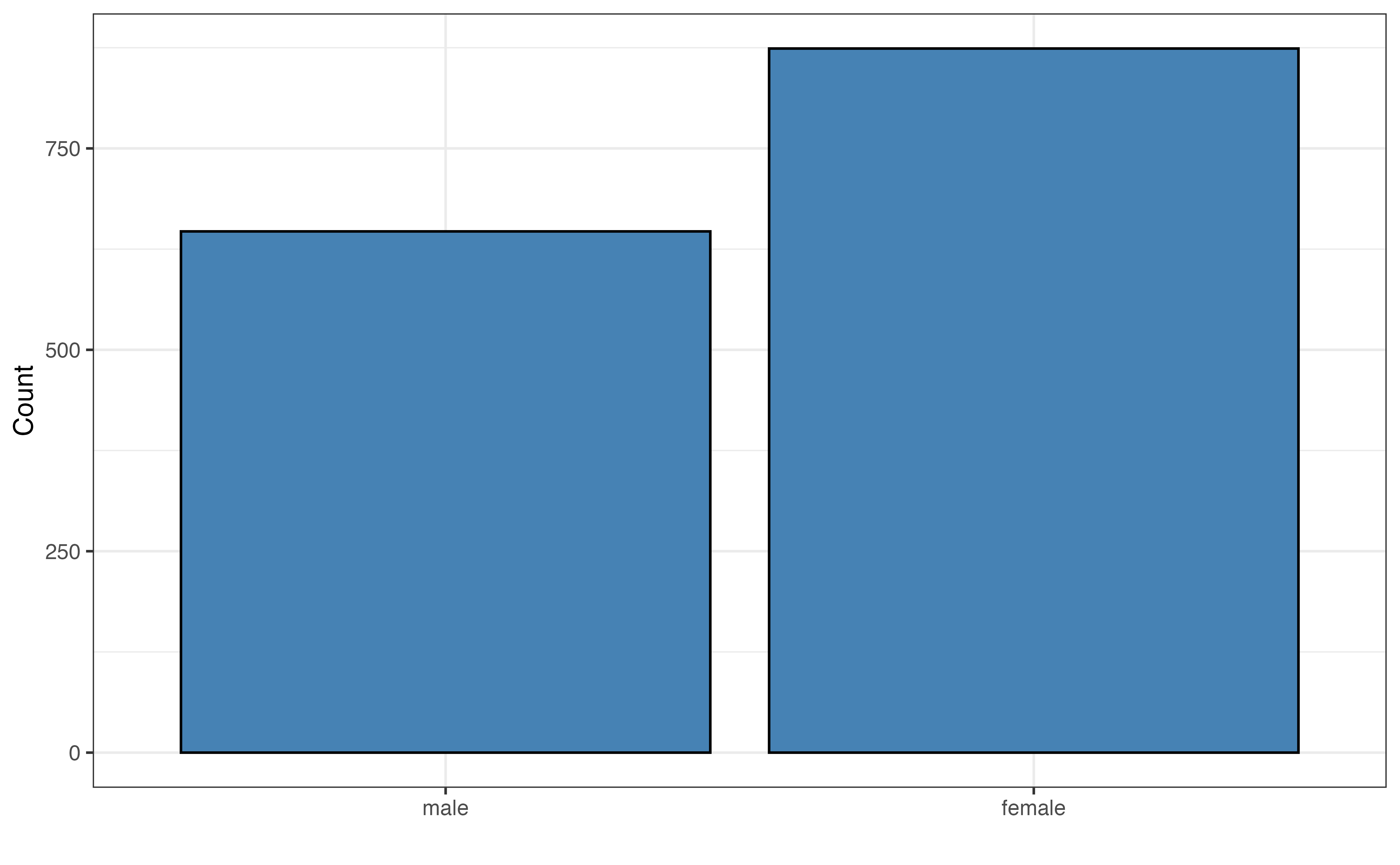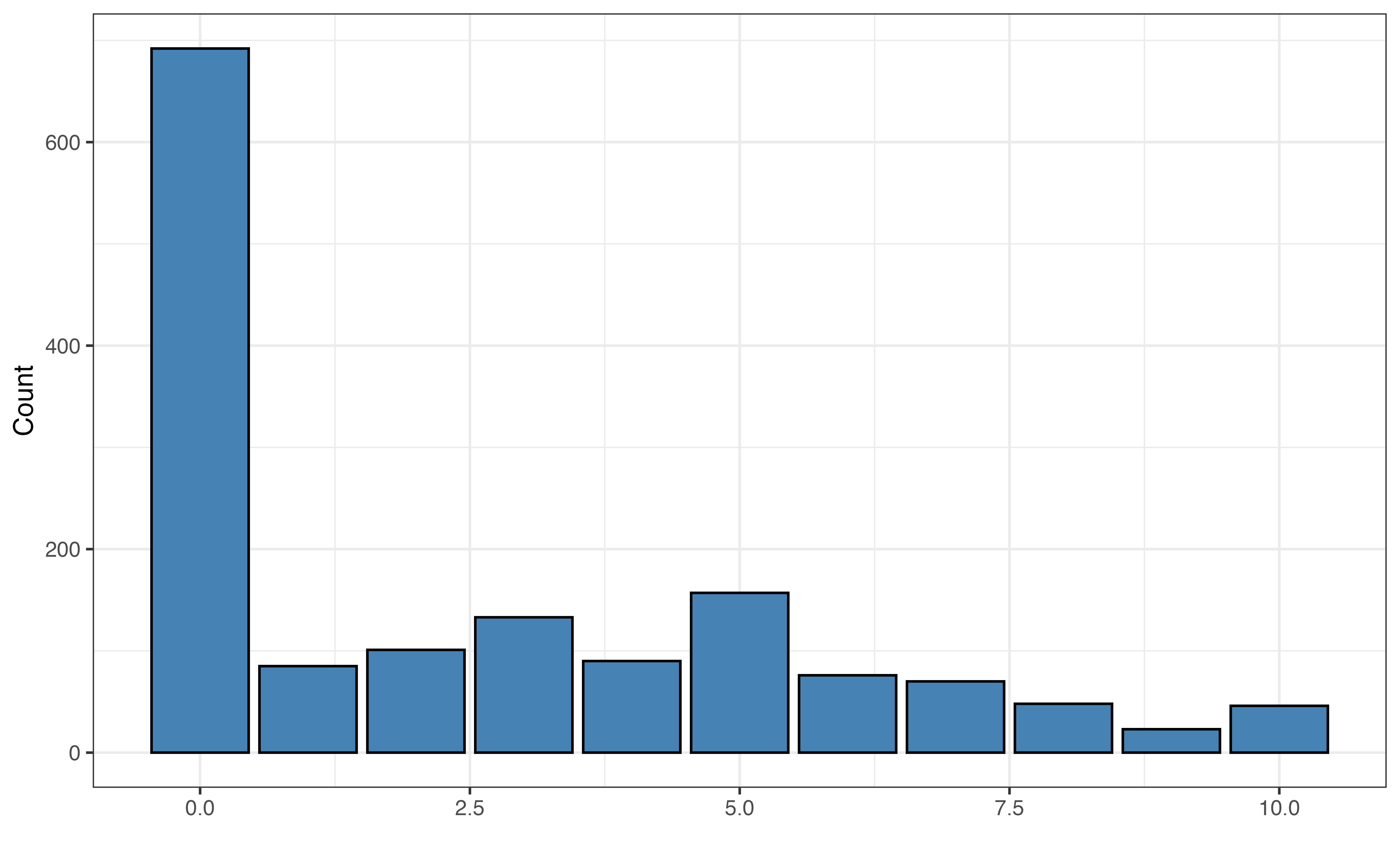Another option for splitting the quantitative variable into bins is to do, such that each bin has an approximately equal number of observations. To do so, we can use the cut2() function from them Hmisc R package (Harrell Jr 2025). The number of bins is specified in the g = argument, and the function will divide the observations into the number of specified bins, such that each bin has an approximately equal number of observations.