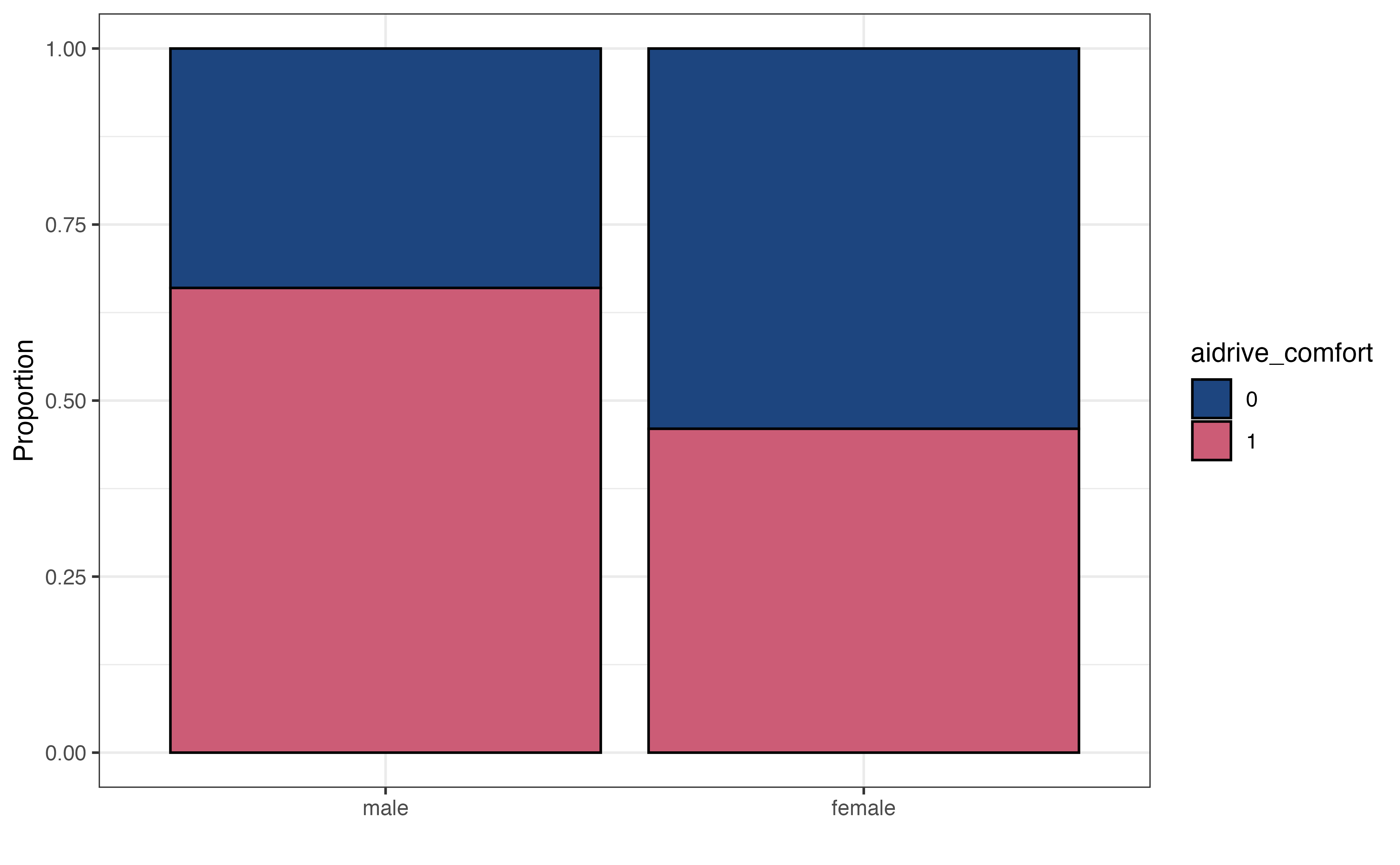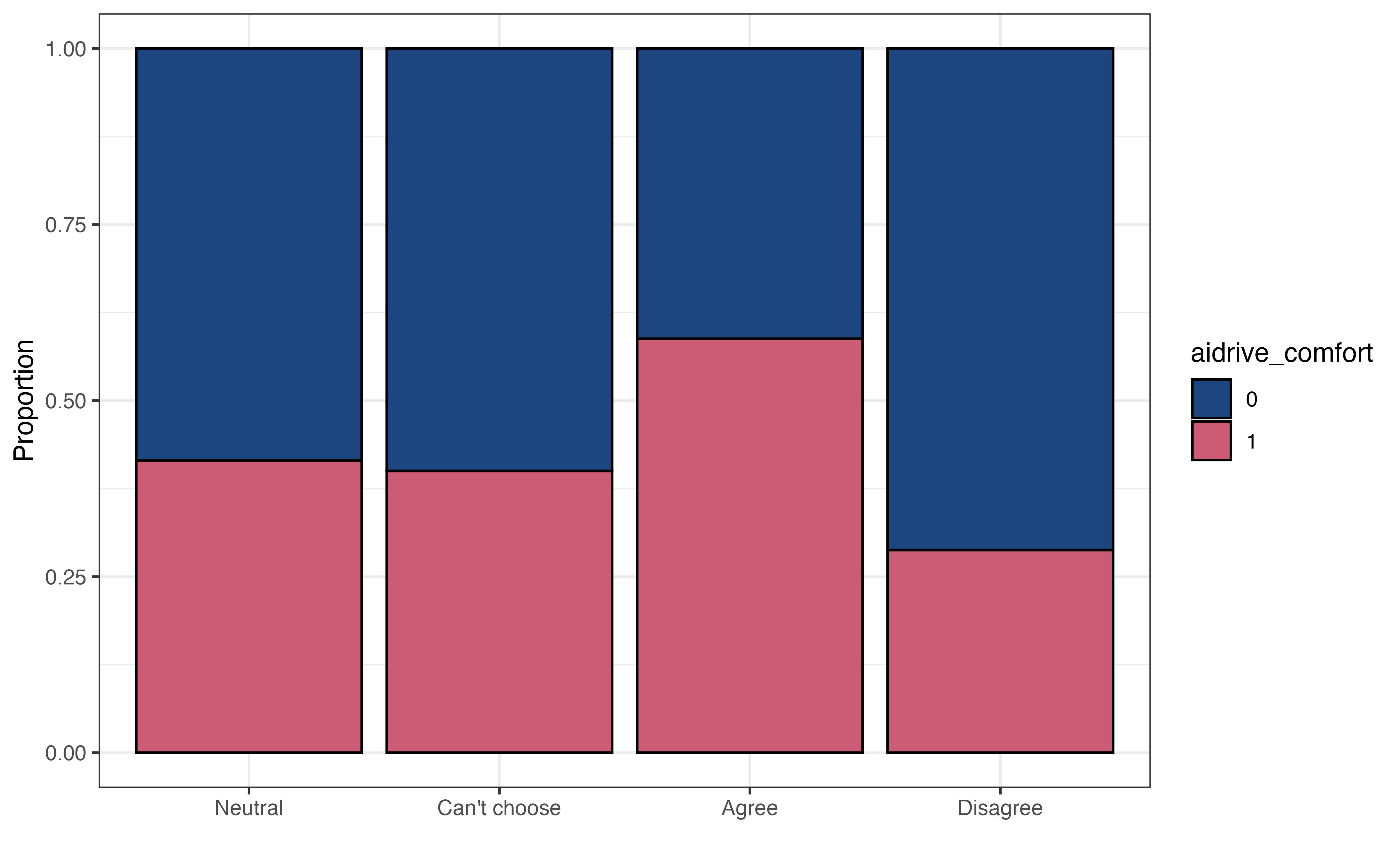 aidrive_comfort: Indicator variable for respondent’s comfort with driverless (self-driving) cars.0: Not comfortable at all;1: At least some comfort.- This variable was derived from responses to the original survey prompt: “Comfort with driverless cars”. Scores ranged from 0 to 10 with 0 representing “totally uncomfortable with this situation” and 10 representing “totally comfortable with this situation”. Responses of 0 on the original survey were coded as