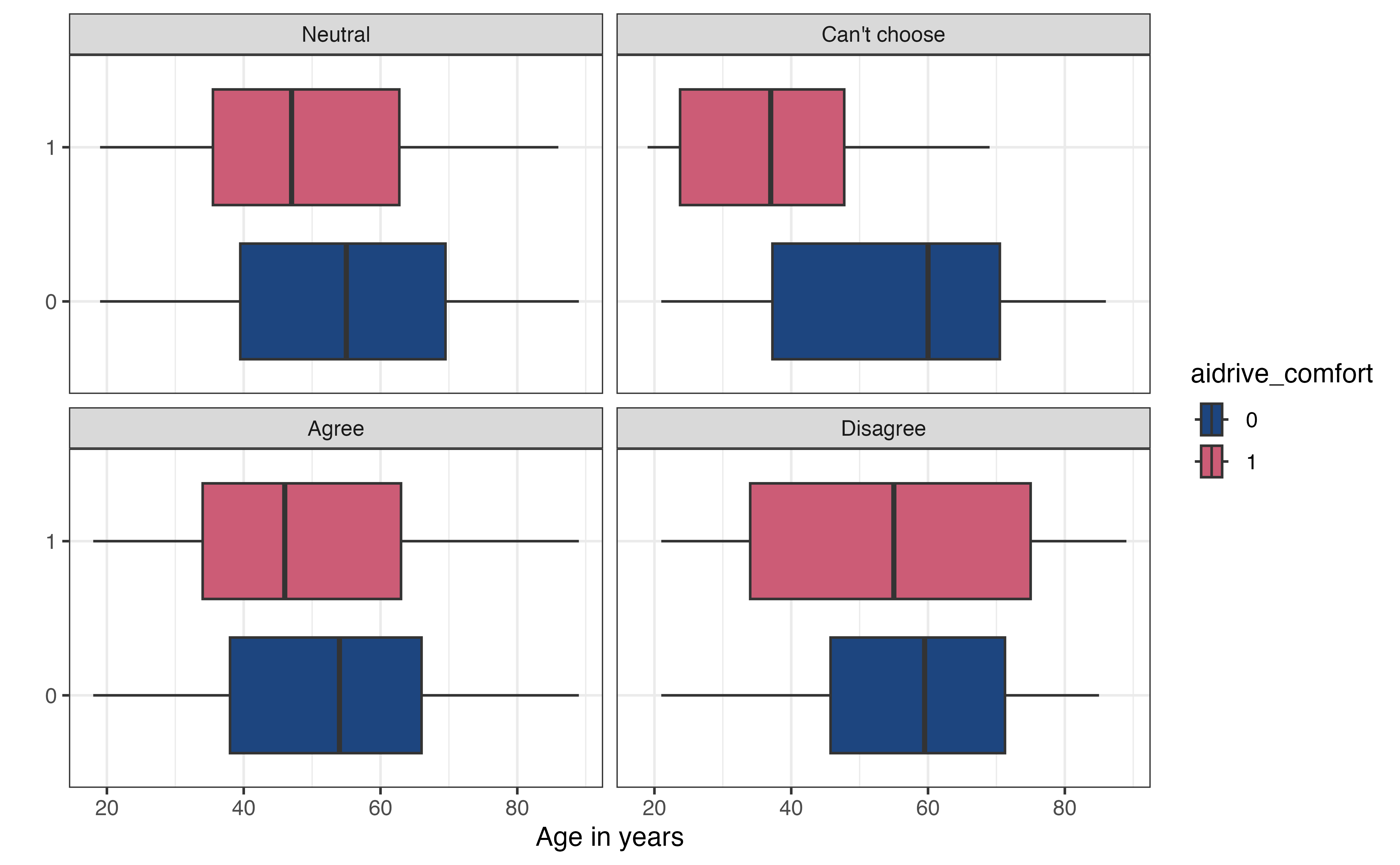 Figure 11.4 (a) is the relationship between age and aidrive_comfort faceted by the categories of tech_easy. As we look at the four sets of boxplots, we observe whether the relationship of the boxplots is the same for each level of tech_easy. If so, this indicates the relationship between age and aidrive_comfort is the same regardless of the value of tech_easy. In Figure 11.4 (a), the relationship in the distributions of age between those who have comfort with driverless cars versus those who don’t looks similar for the categories “Neutral”, “Agree”, and “Disagree”. The boxes largely overlap and the median age is approximately the same between the two groups of aidrive_comfort. The relationship does appear to be different among those in the “Can’t choose” category, as the median age among those who are not comfortable with driverless cars is higher than those who are comfortable.