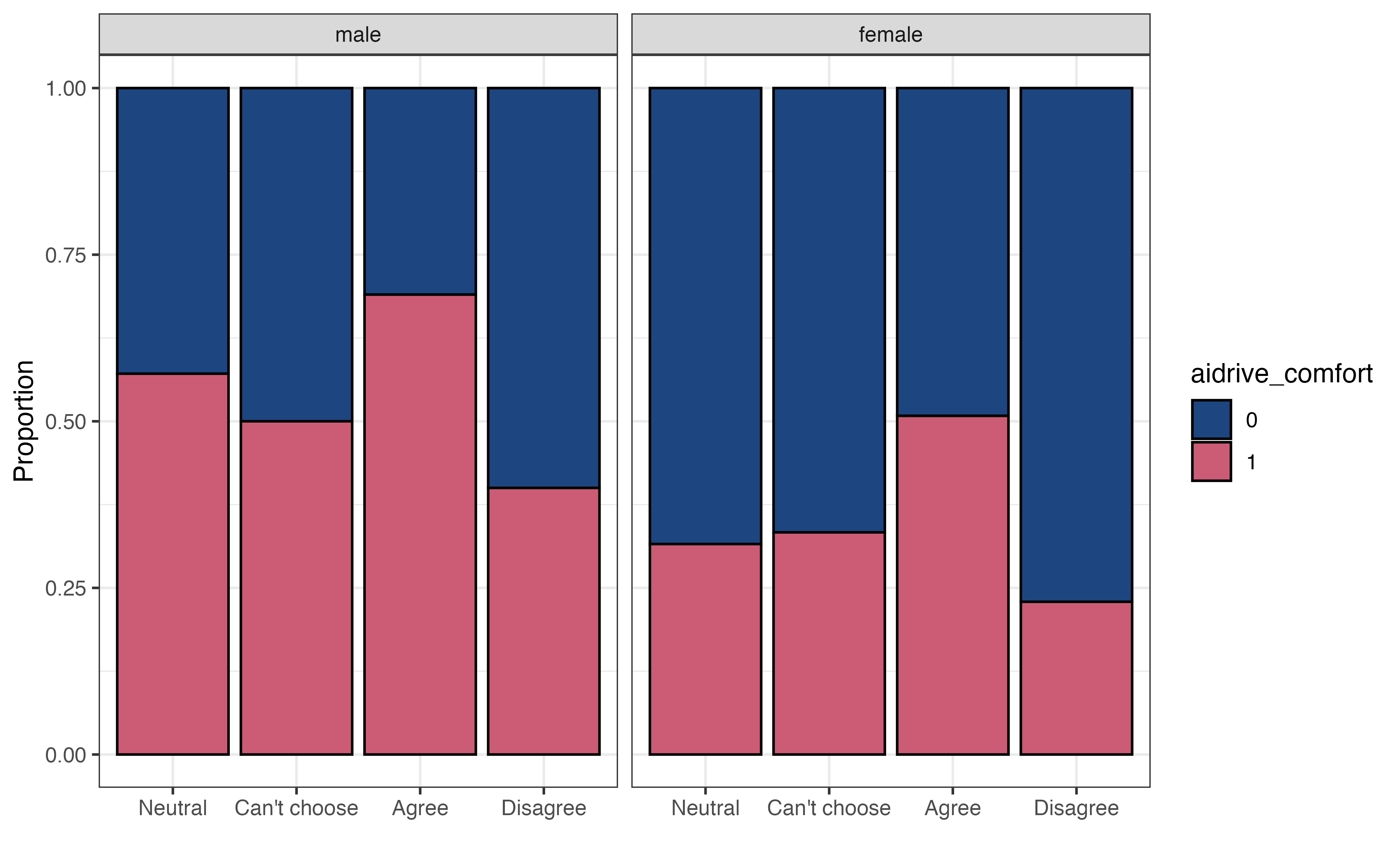 There does appear to be some relationship. A higher proportion of those who agree technology makes life easier have comfort with driverless cars.↩︎