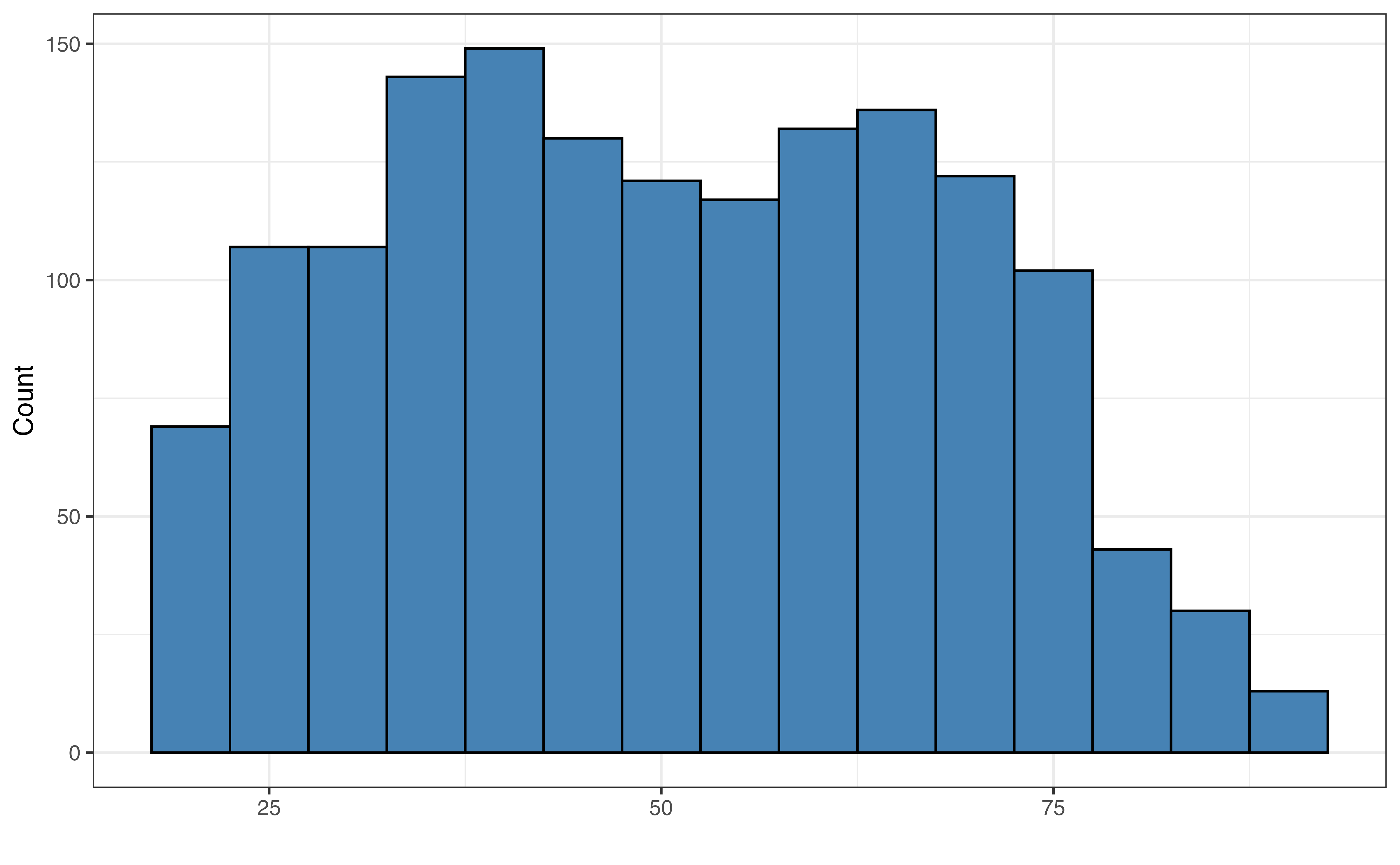 Figure 11.2 and Table 11.1 shows the univariate distributions of the predictor variables that will be used in this chapter. The exploratory data analysis for the other predictors is in Chapter 12 . The mean age in the data is about 50.4 and the median is 49 years old. The youngest respondents in the data set are 18 and the oldest are 89 years old. The standard deviation is about 17.645 years, so the data spans the general age range for adults in the United States.