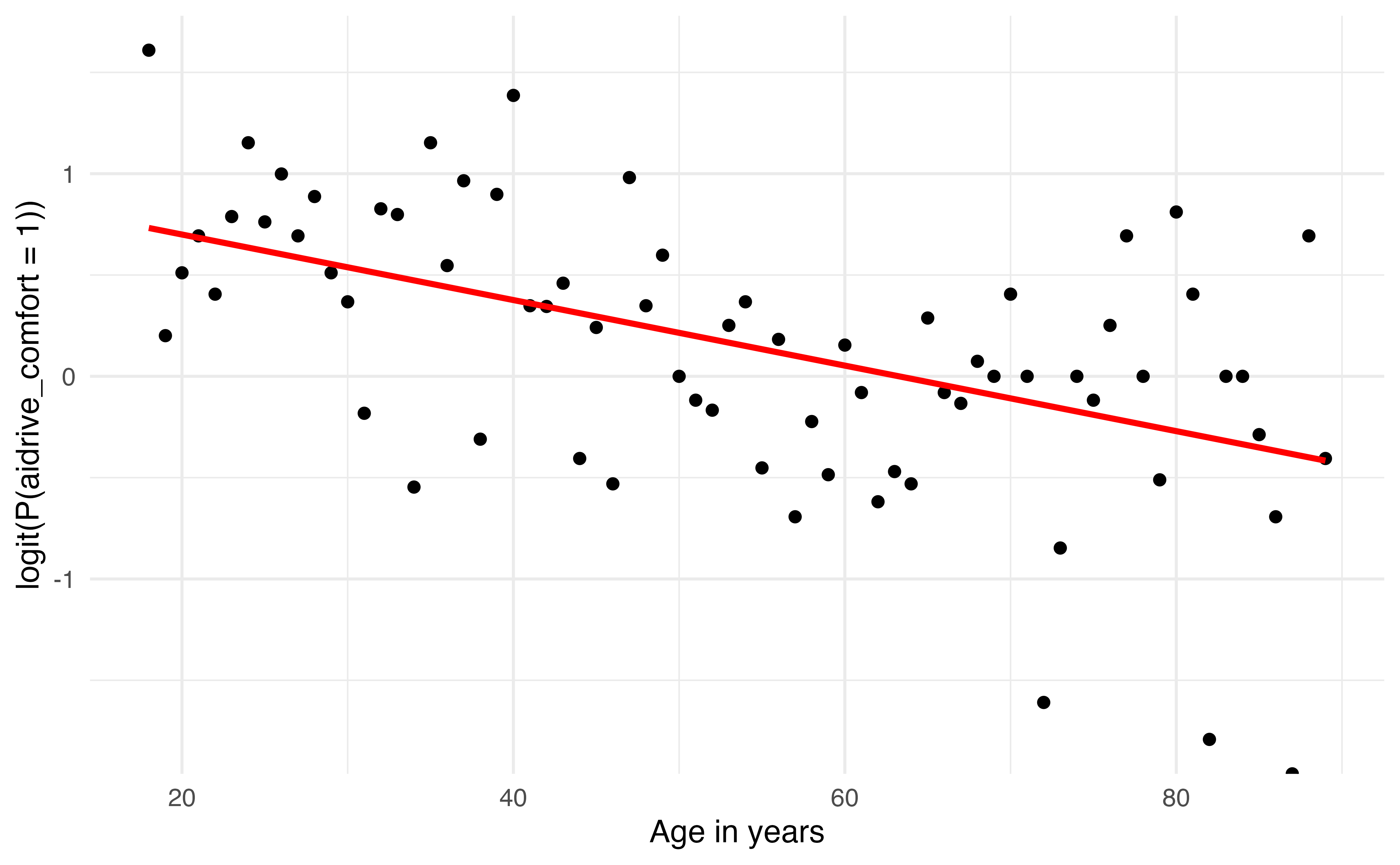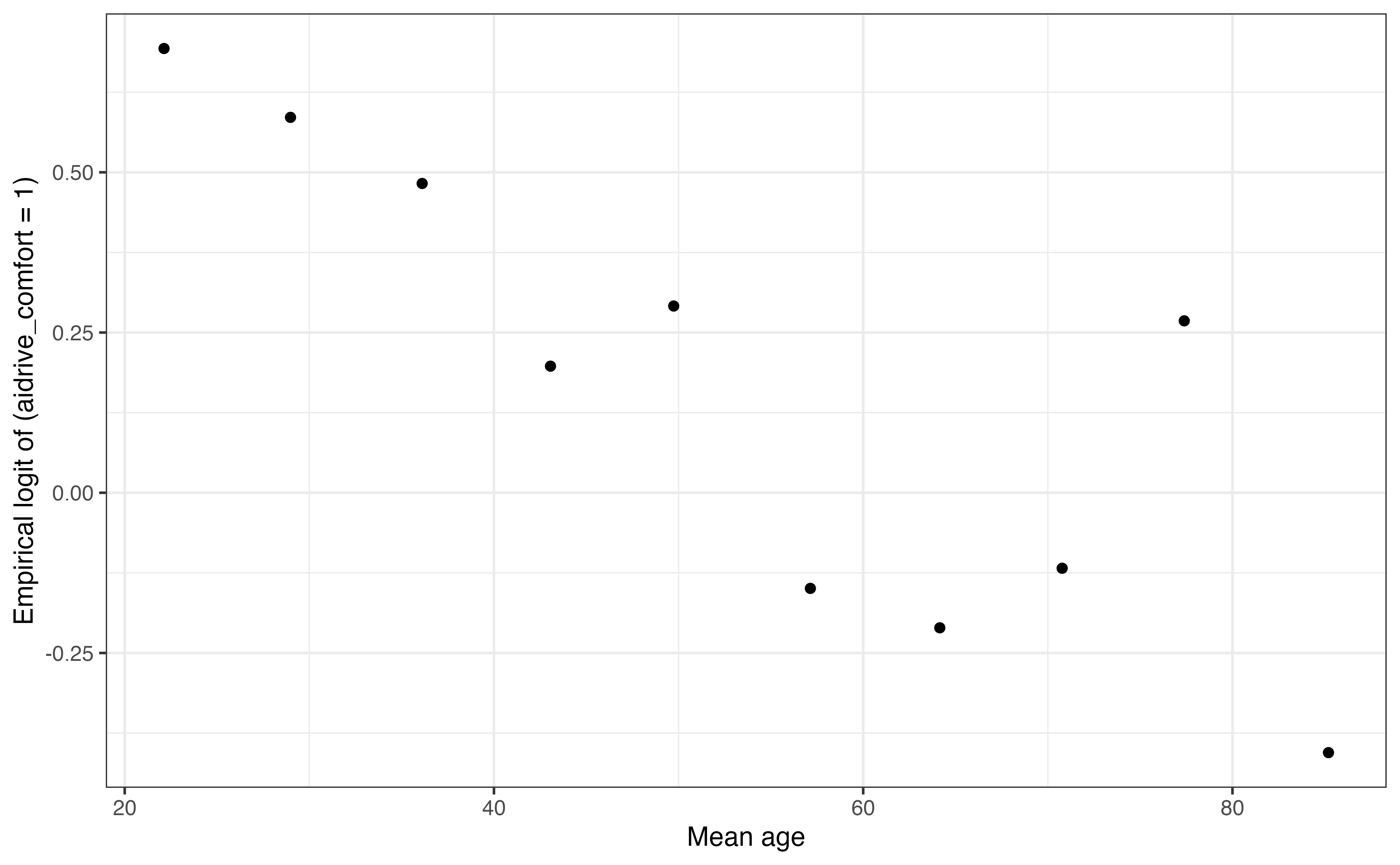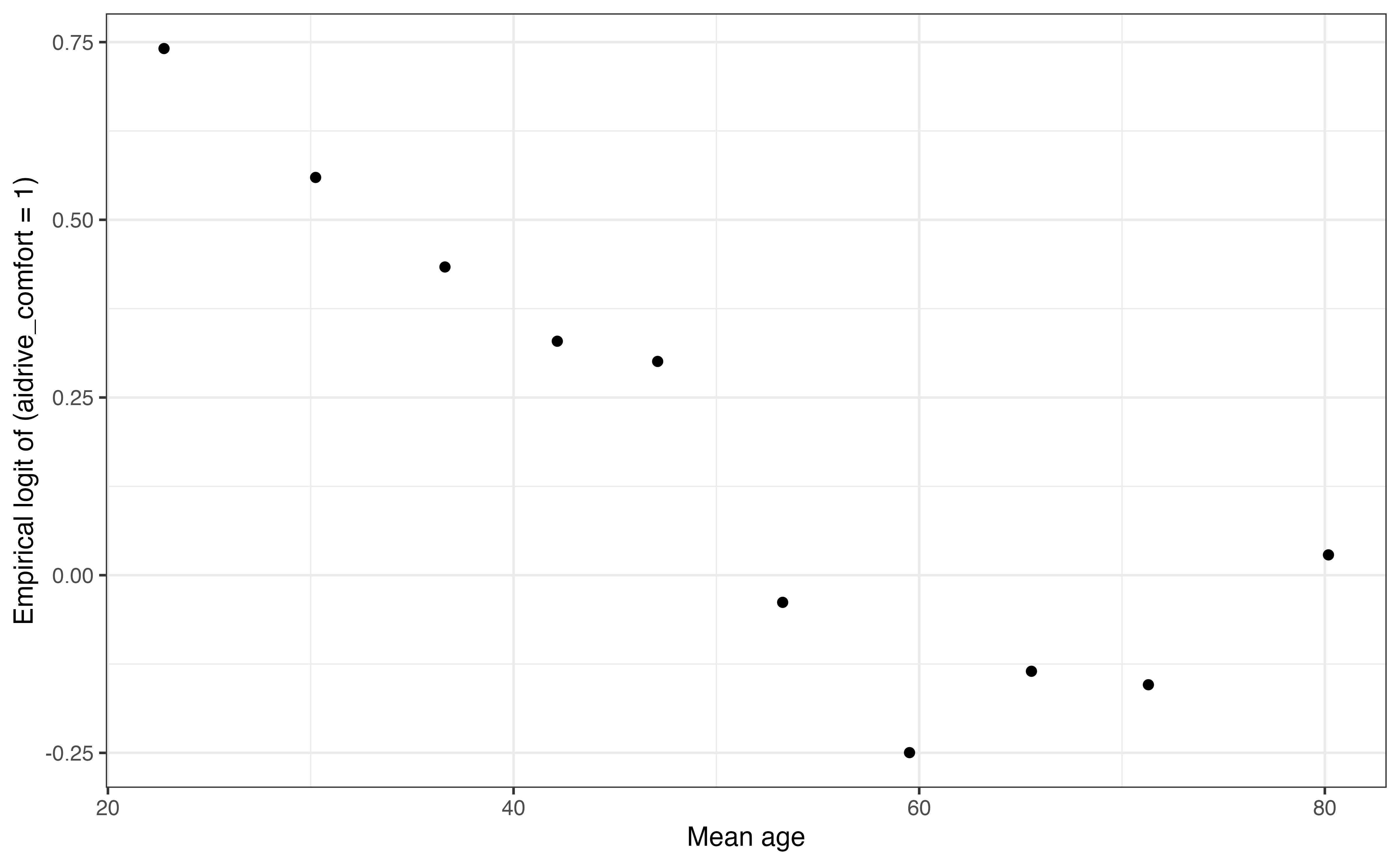 Once the bins are defined, the remainder of the code is the same as before, where the probability and empirical logit are computed for each bin. Here is the code to compute the empirical logit of comfort with driverless cars by age, where age is divided into 10 bins. Here, the cut() function divided the age into bins of length 7.