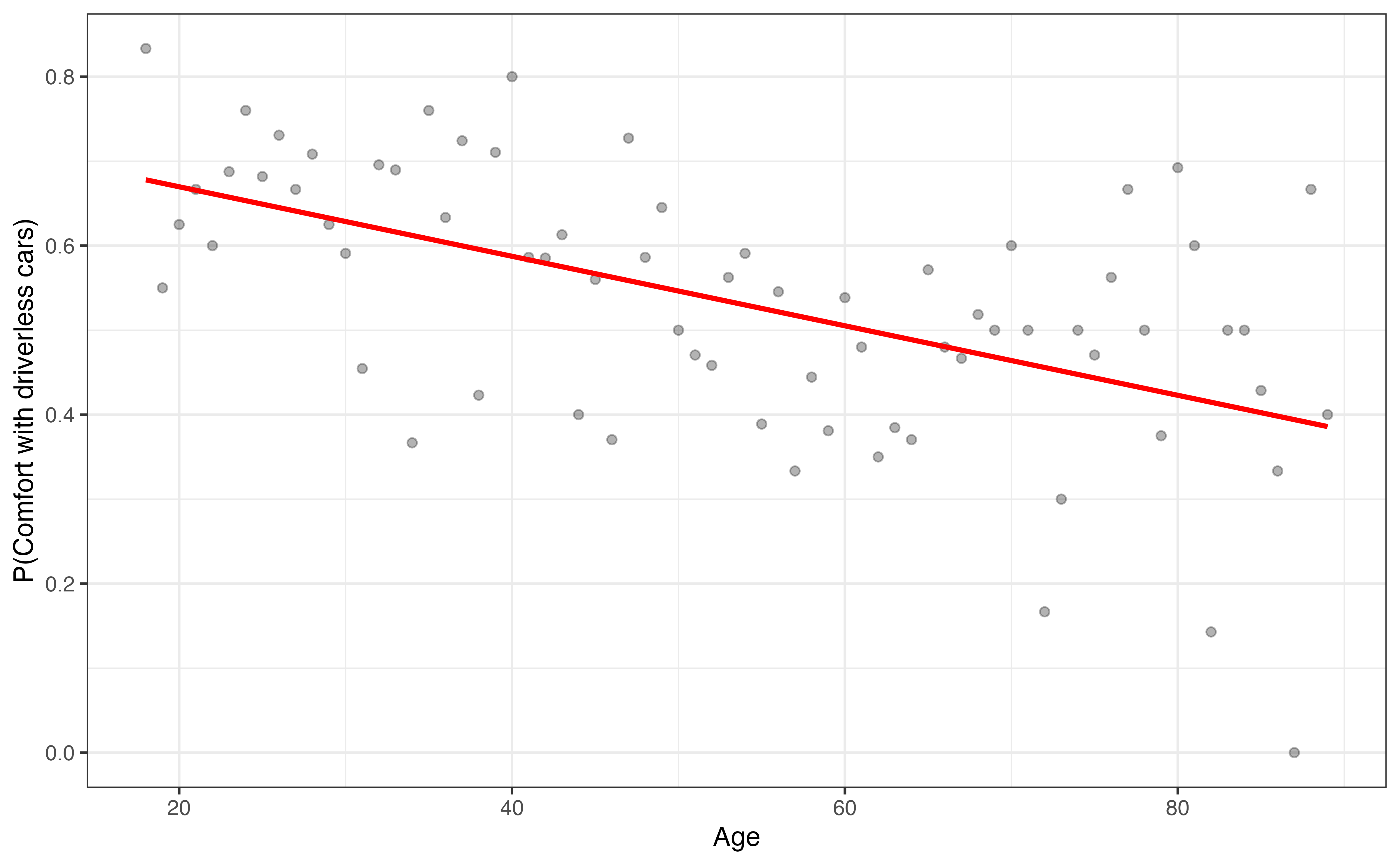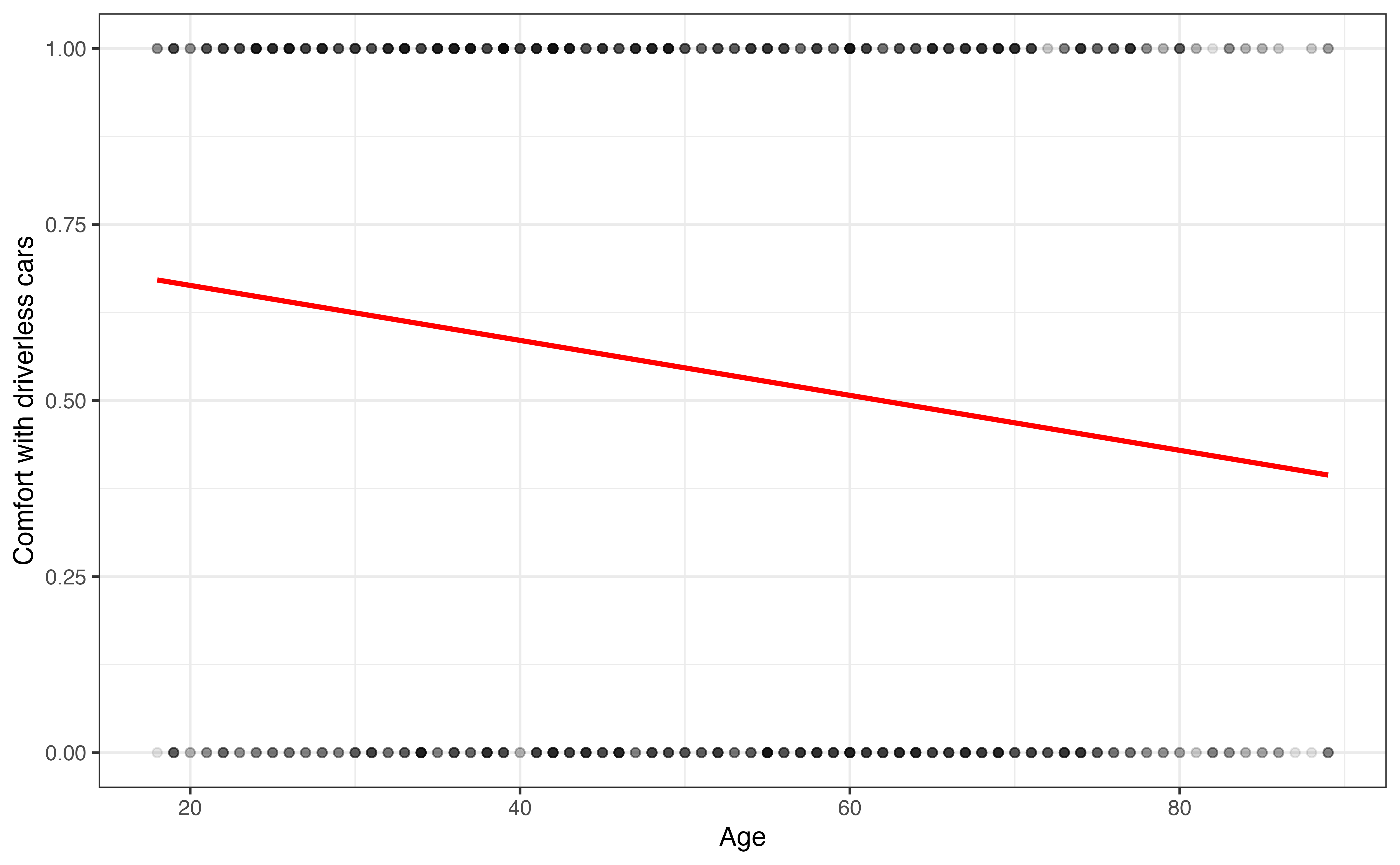 and .↩︎We are 95% confident that for each additional year in age, the odds of being comfortable with driverless cars are expected to multiply by 0.979 (